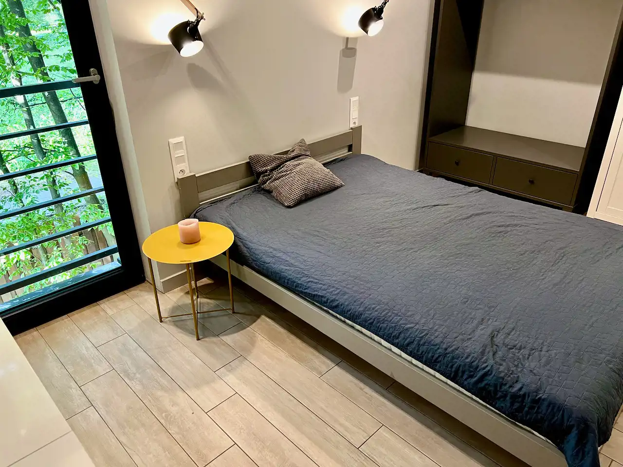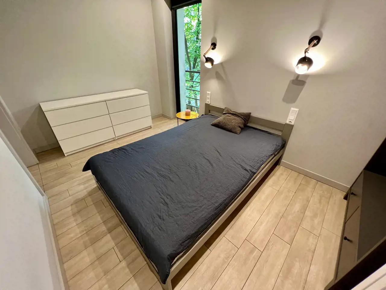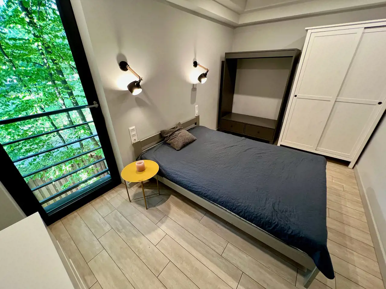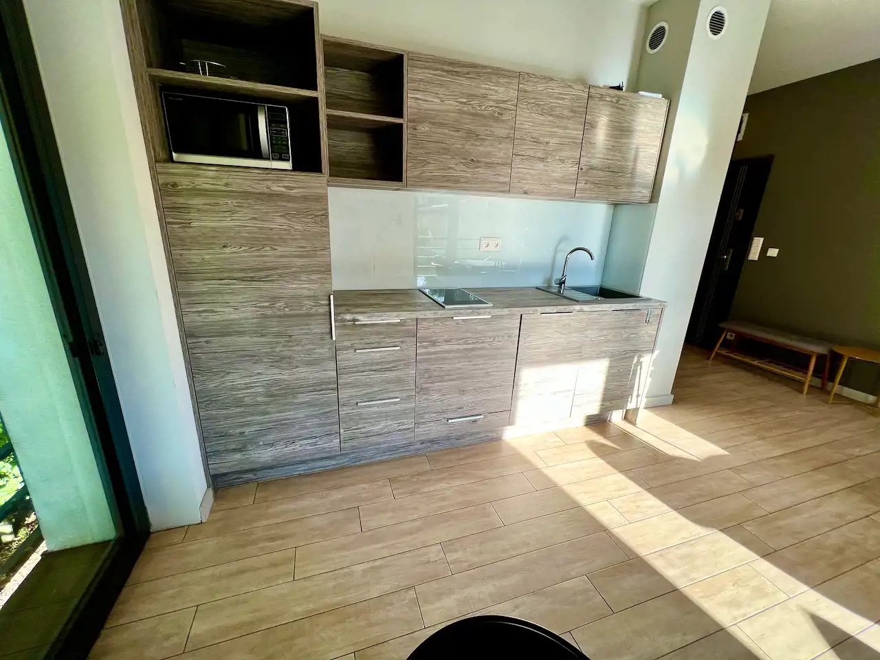 Mieszkanie jest umeblowane i wyposażone. Jest tutaj salon z aneksem kuchennym i sypialnia. W kuchni meble pod wymiar, zabudowany sprzęt AGD (piekarnik, lodówka, zmywarka), wyciąg i płyta elektryczna. Łazienka z kabiną prysznicową.
