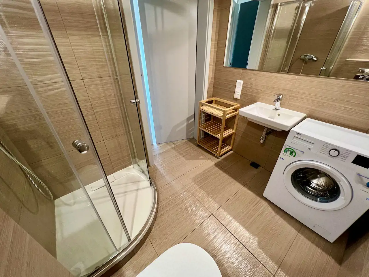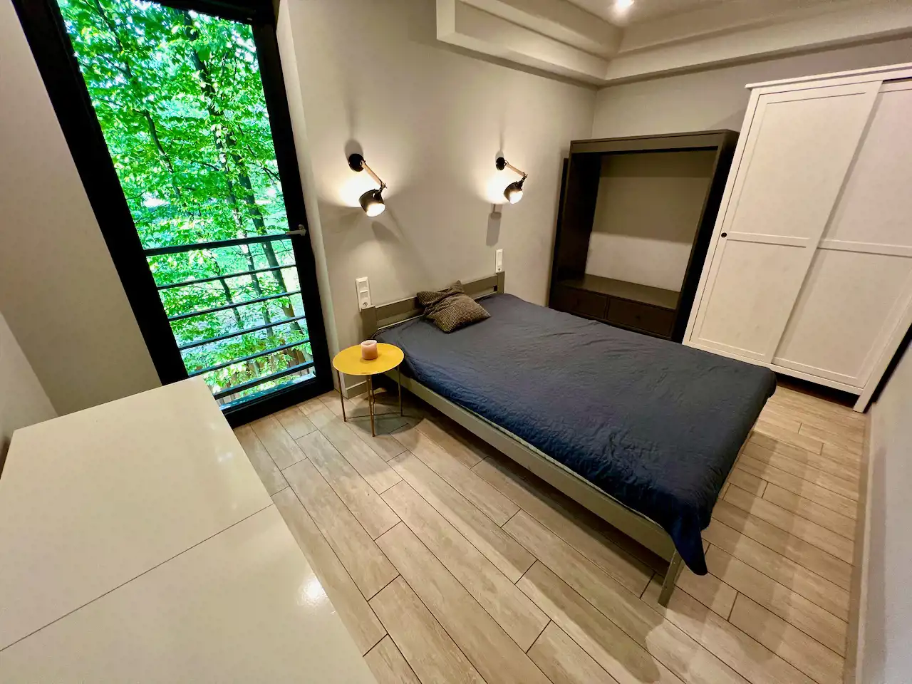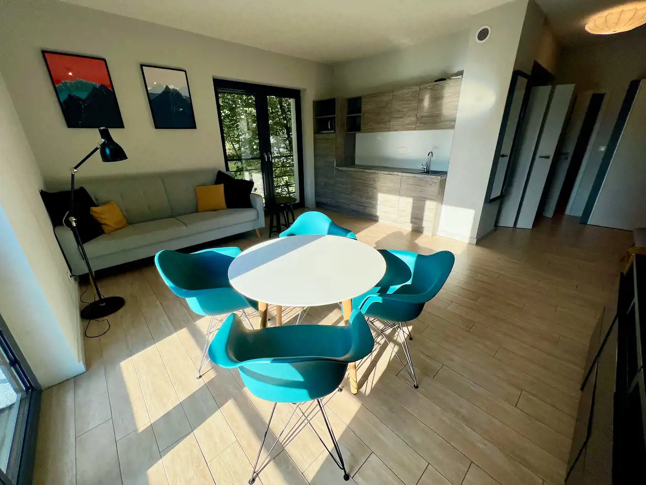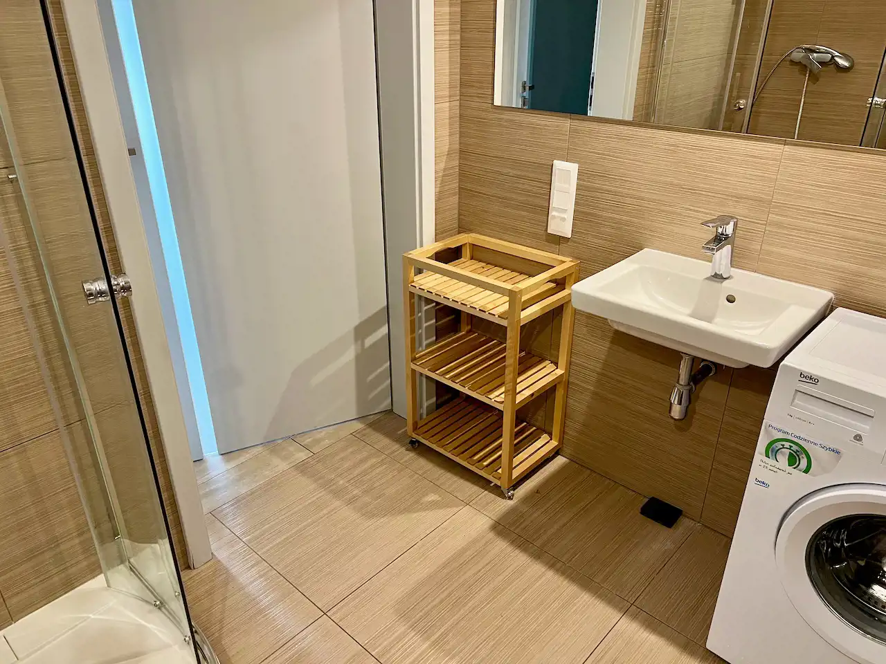 Mieszkanie jest umeblowane i wyposażone. Jest tutaj salon z aneksem kuchennym i sypialnia. W kuchni meble pod wymiar, zabudowany sprzęt AGD (piekarnik, lodówka, zmywarka), wyciąg i płyta elektryczna. Łazienka z kabiną prysznicową.
