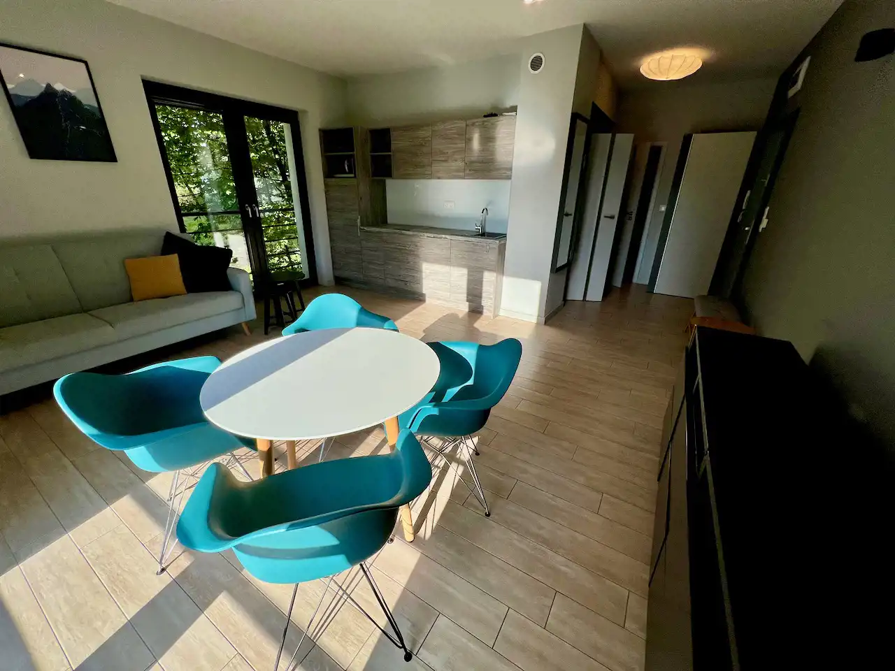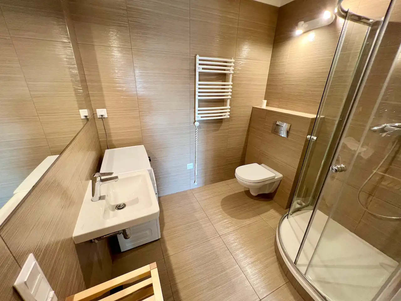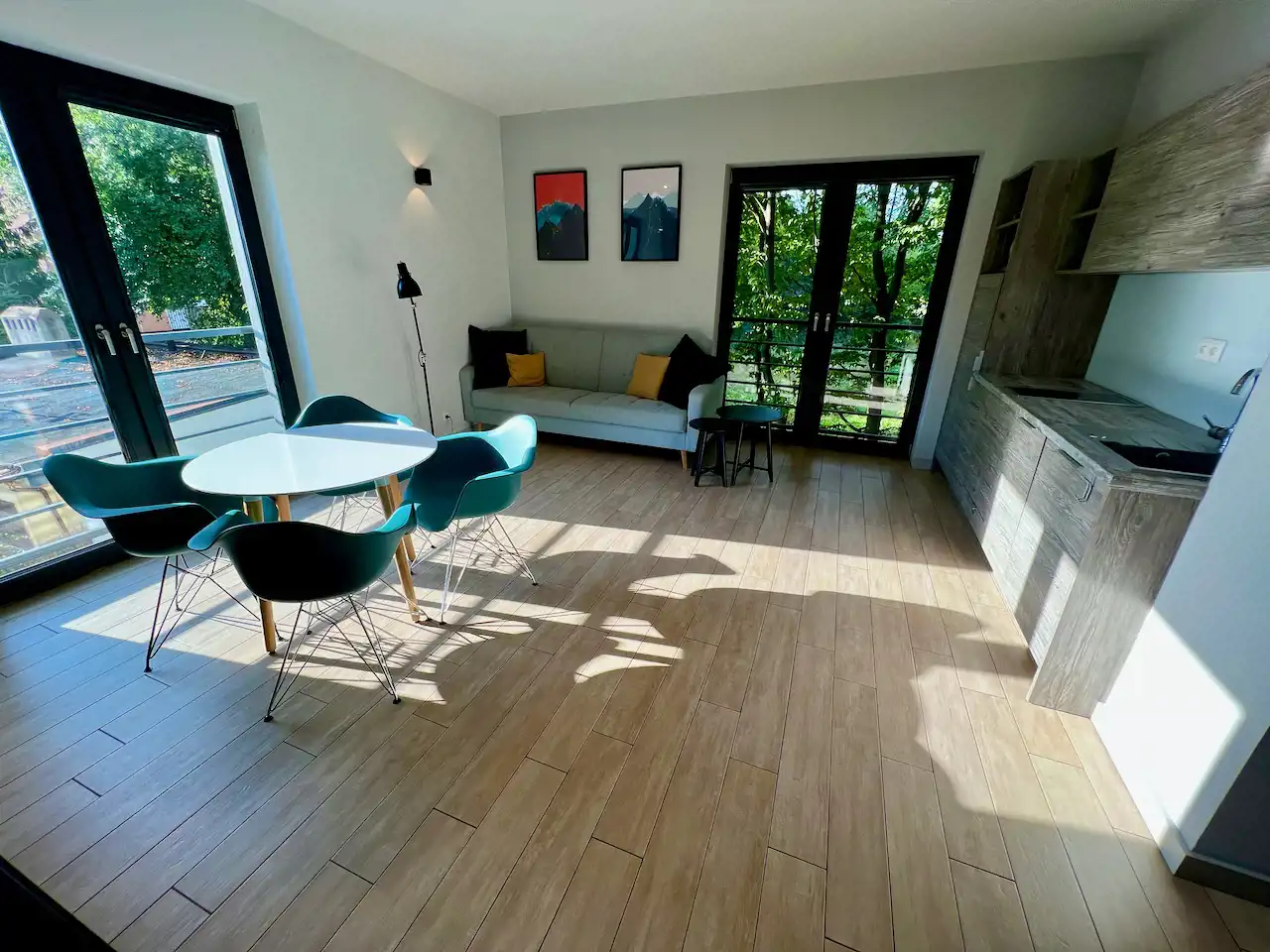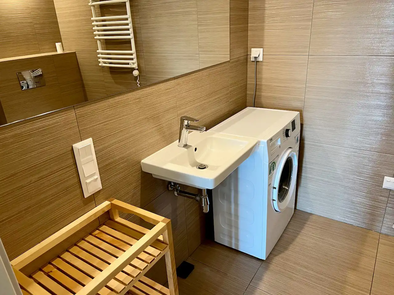 Mieszkanie jest umeblowane i wyposażone. Jest tutaj salon z aneksem kuchennym i sypialnia. W kuchni meble pod wymiar, zabudowany sprzęt AGD (piekarnik, lodówka, zmywarka), wyciąg i płyta elektryczna. Łazienka z kabiną prysznicową.
