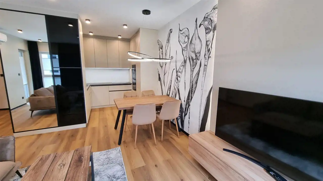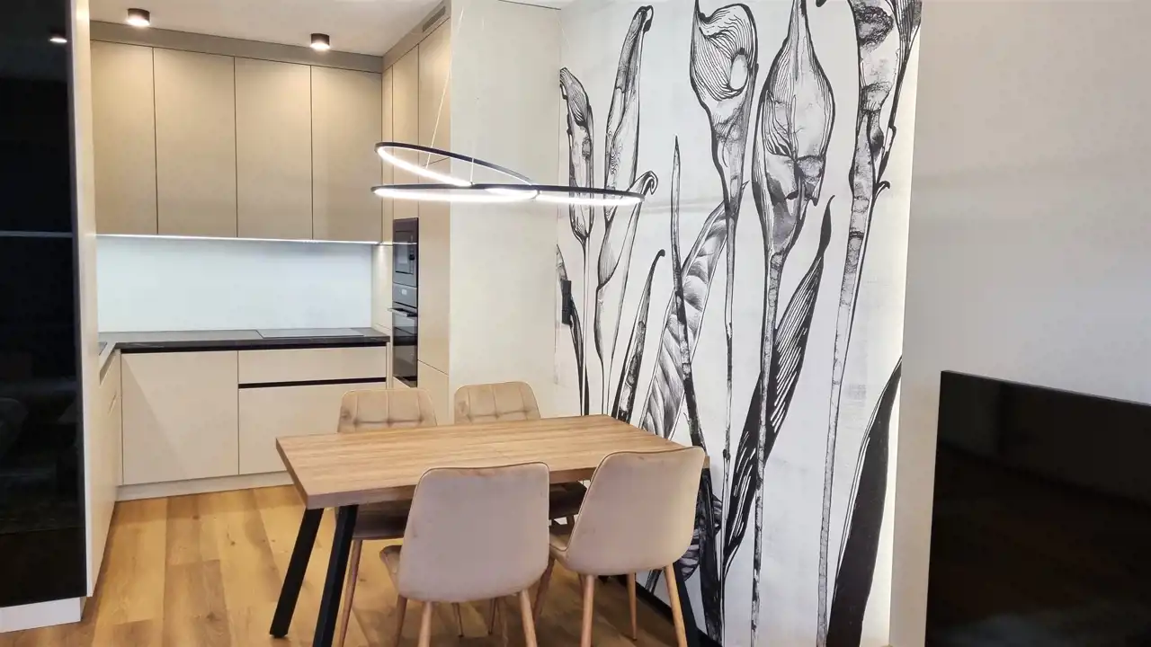 - POKÓJ DZIENNY/SALON połączony z aneksem kuchennym : kanapa narożna, stolik kawowy, szafka RTV , telewizor, stół + 4 krzesła, dywan, zasłony, roletki - plisy okienne, ściany gładzie gipsowe i ozdobna tapeta, podłoga eleganckie panele, klimatyzacja