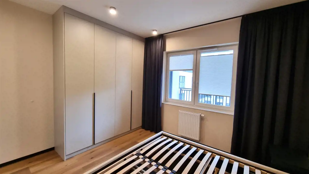 - SYPIALNIA: łóżko podwójne z materacem, 2 szafki nocne, duża szafa w zabudowie, zasłony, roletki okienne - plisy,ściany gładzie gipsowe
