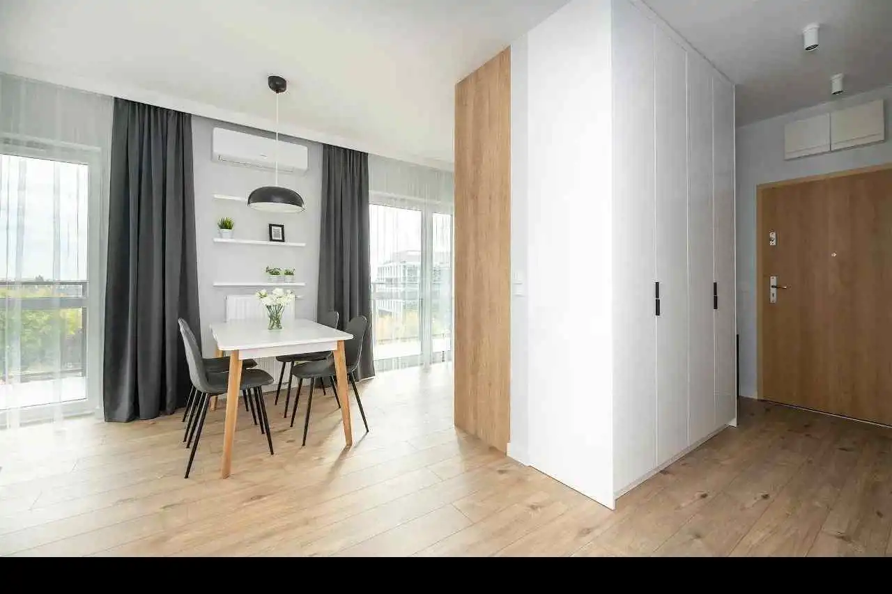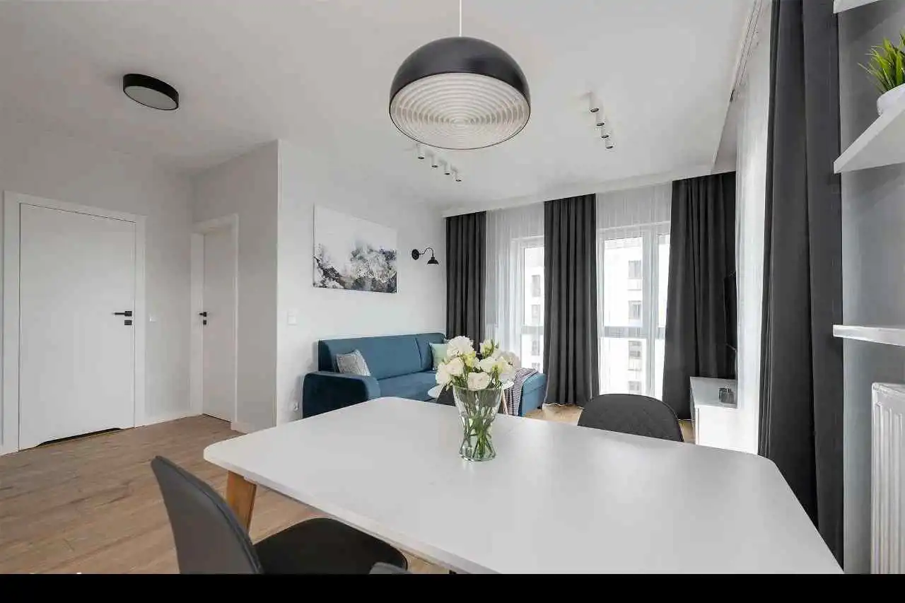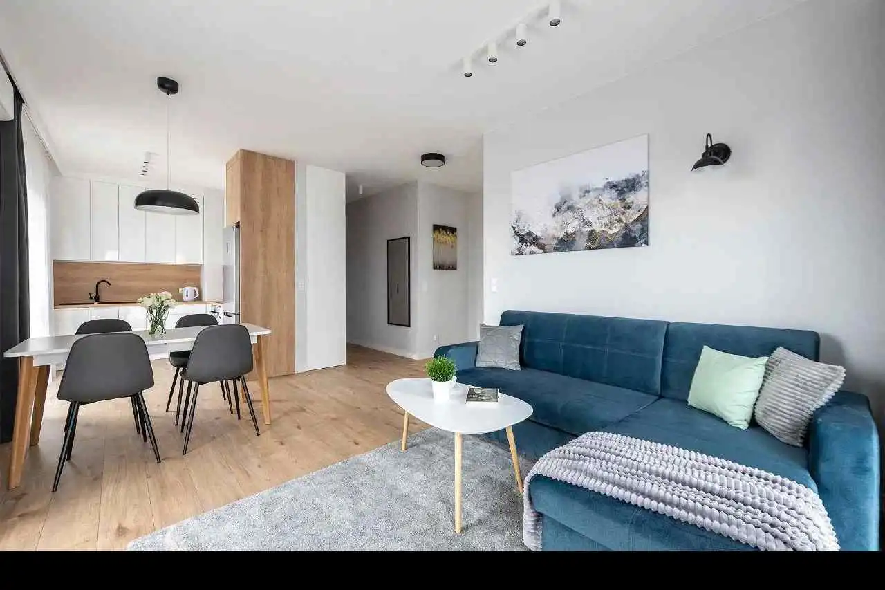 Apartament jest w pełni wyposażony. Urządzony w nowoczesnym stylu. W salonie znajduje się wygodna kanapa, stolik kawowy, szafka RTV, telewizor, stół z krzesłami. Aneks kuchenny został wyposażony we wszystkie niezbędne sprzęty m.in. zlewozmywak z baterią, lodówko zamrażarka, piekarnik, mikrofalę, zmywarkę płytę indukcyjną. Sypialnia w pełni urządzona - duże, wygodne łóżko małżeńskie z materacem, pakowna szafa w zabudowie. W przedpokoju pakowna szafa, natomiast w łazience prysznic, toaleta, umywalka, szafki oraz pralka.