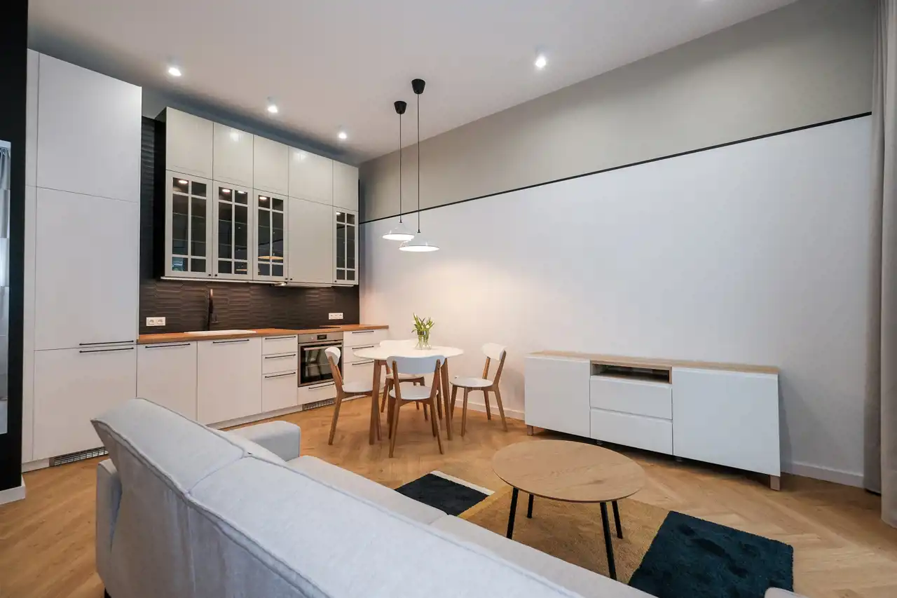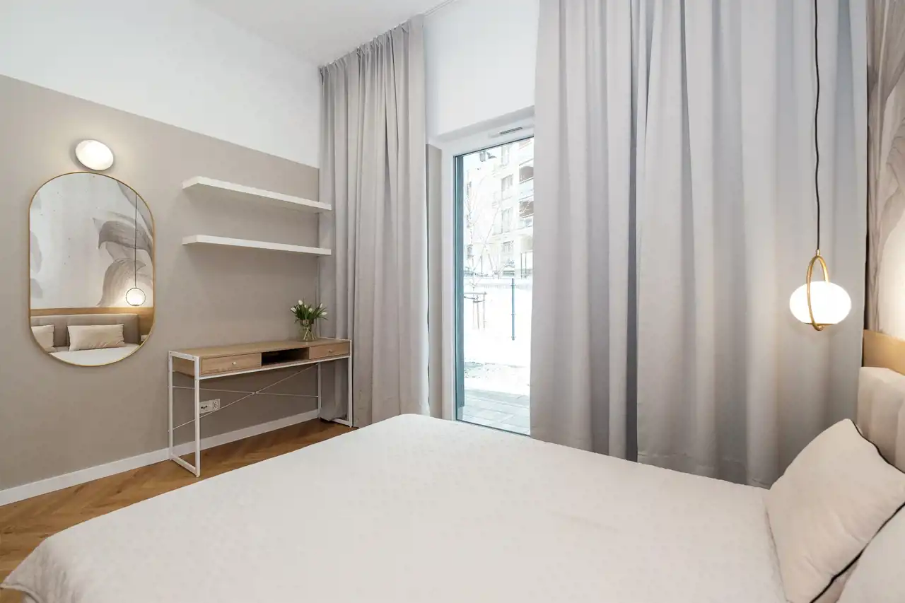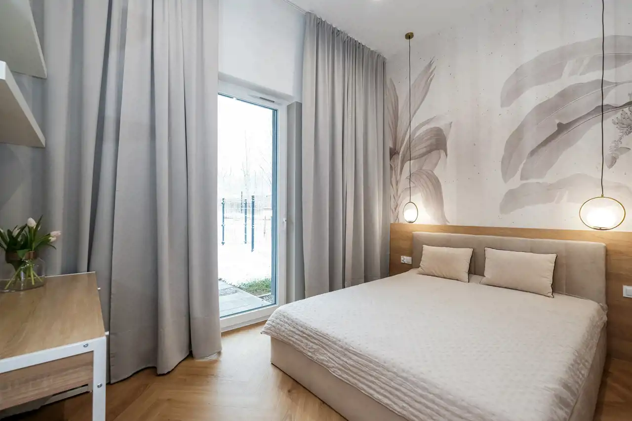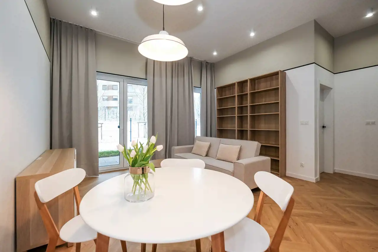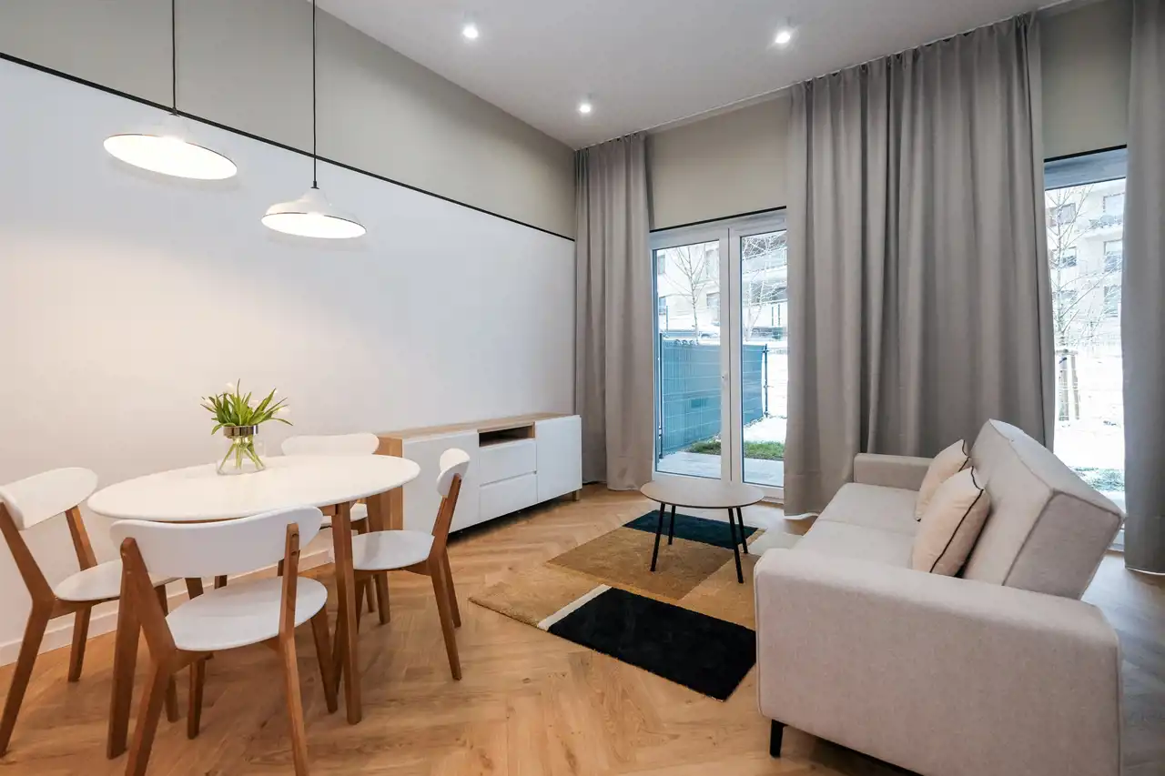 Mieszkanie w pełni umeblowane i wyposażone. W części wypoczynkowo-kuchennej zabudowa kuchenna z miejscem do siedzenia (na wyposażeniu min. piekarnik, płyta indukcyjna, lodówka z zamrażarką, zmywarka) kanapa, szafka RTV oraz wyjście na własny ogródek.
