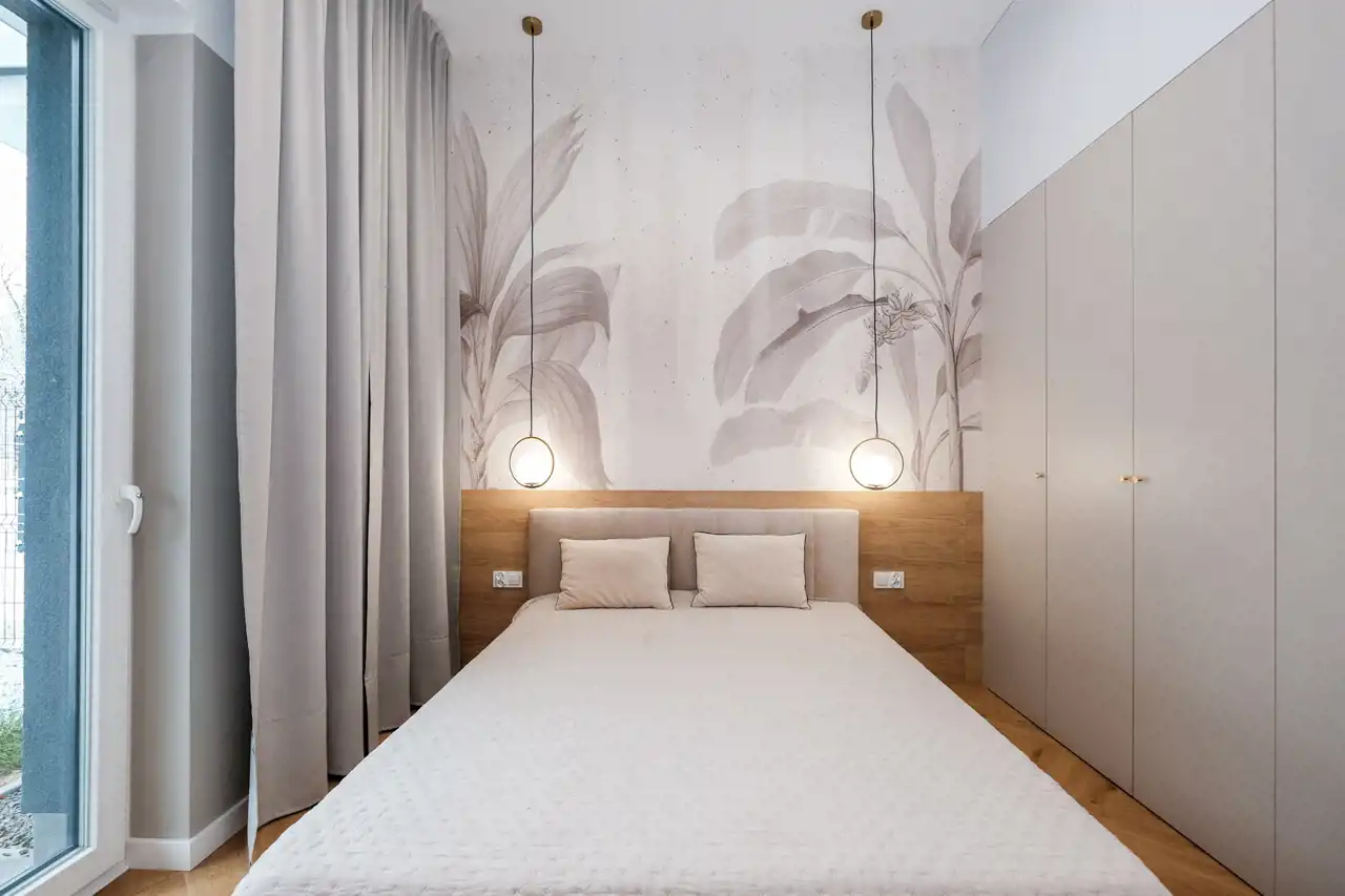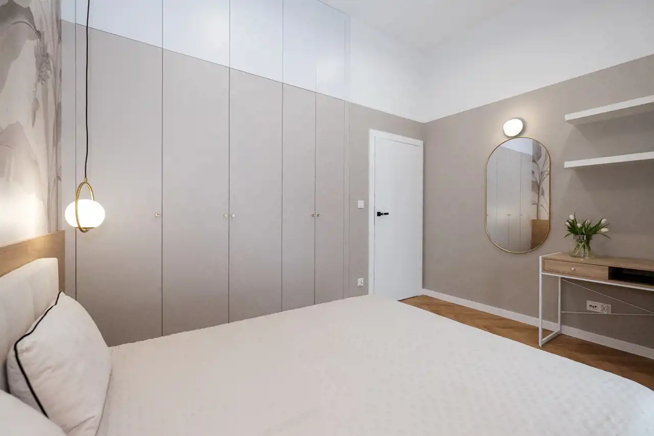 W sypialni szafa, małżeńskie łóżko, miejsce do pracy.