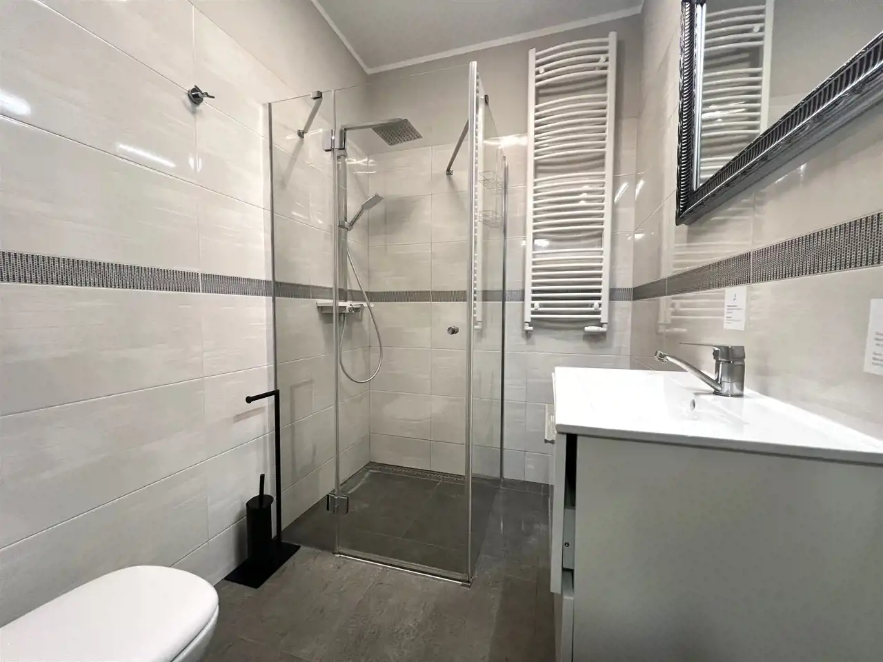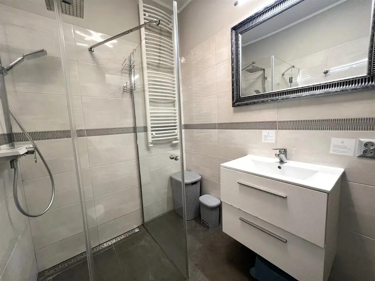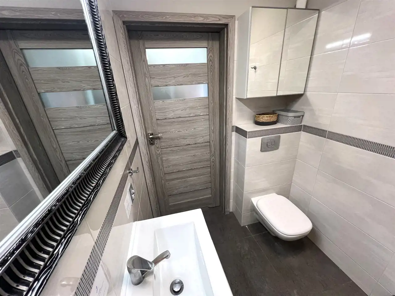 - ŁAZIENKA z WC: kabina prysznicowa,umywalka z szafką, lustro wiszące z oświetleniem, sedes podwieszany, kosz na śmieci, szafka wisząca z lustrem,