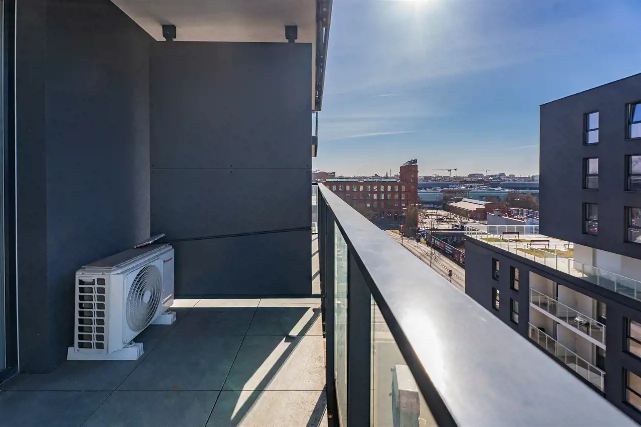 Apartament posiada ogromny taras, około 8 m2, z którego roztacza się wspaniały widok na Manufakturę i panoramę miasta. W upalne dni, do dyspozycji najemcy Klimatyzacja, sterowana z pilota. Do mieszkania przynależy miejsce parkingowe w garażu podziemnym.
