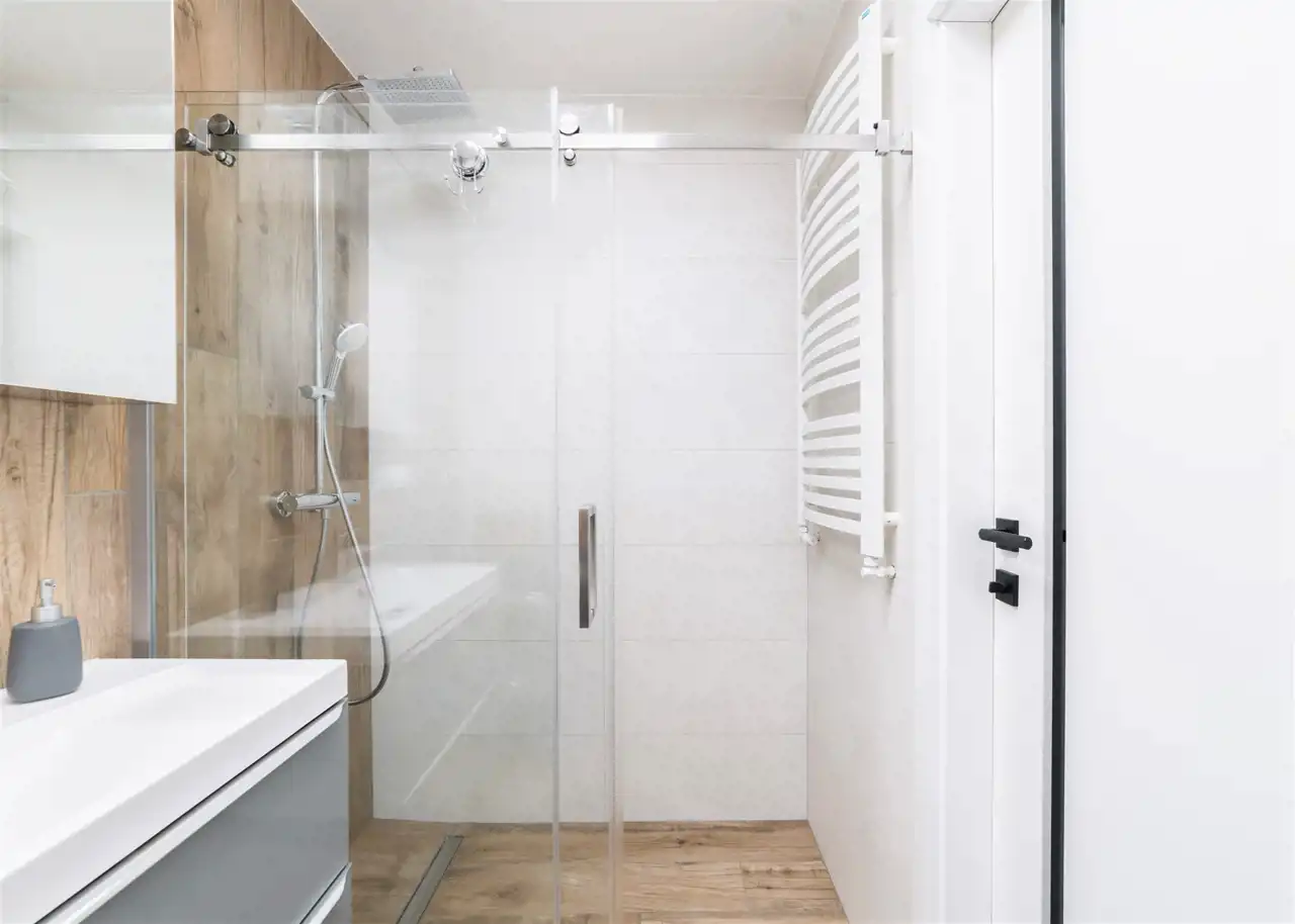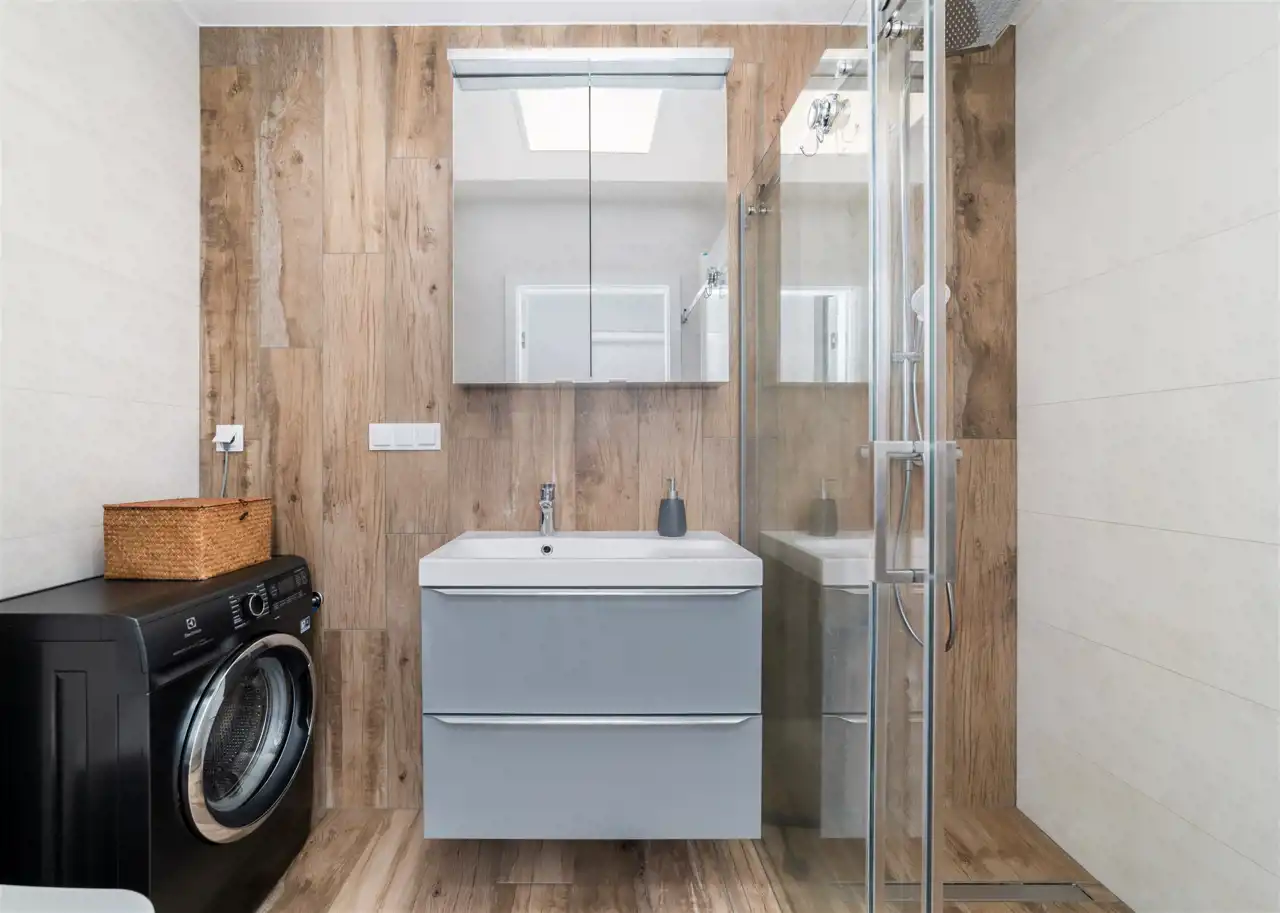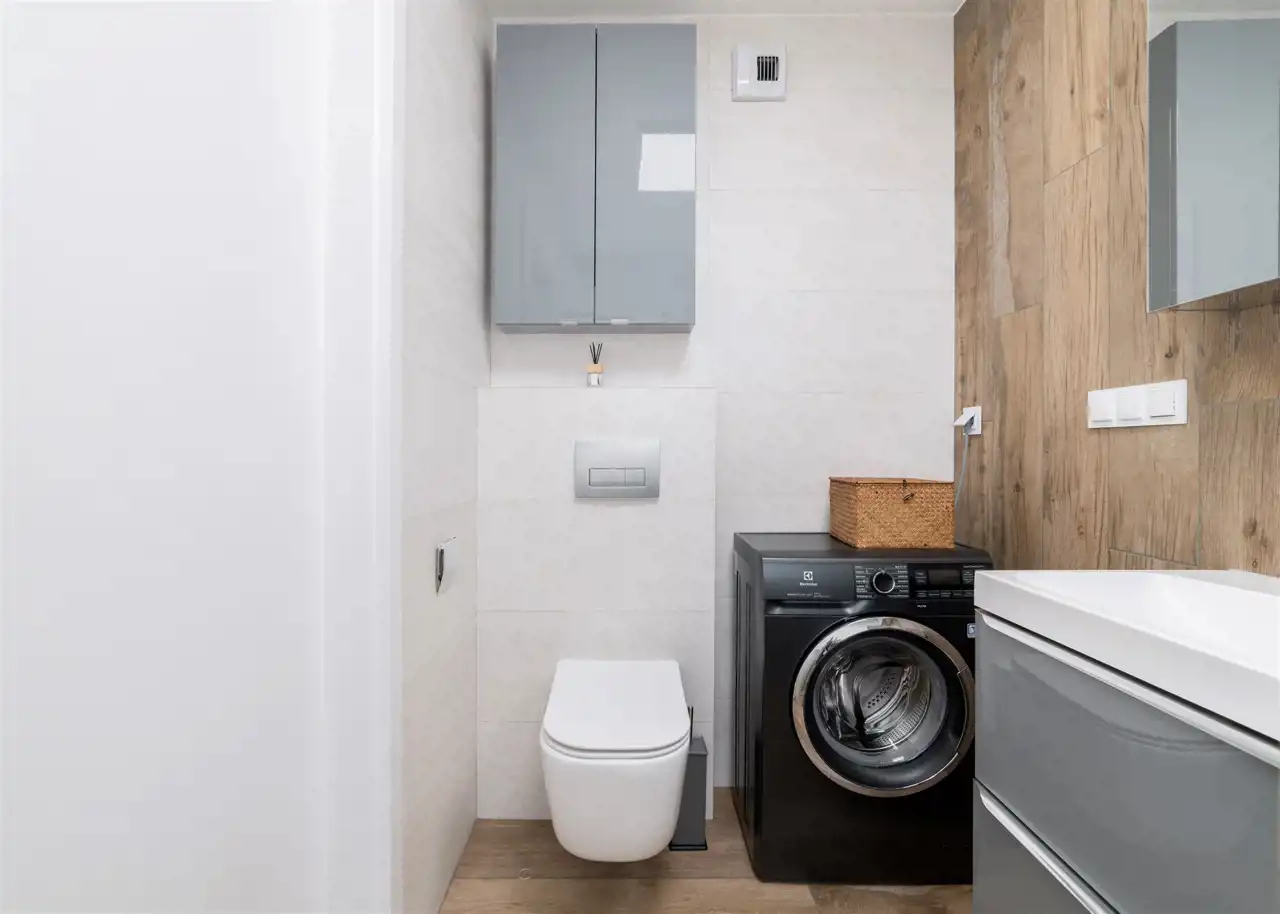 - nowoczesną łazienkę z WC wyposażoną w prysznic oraz pralkę;