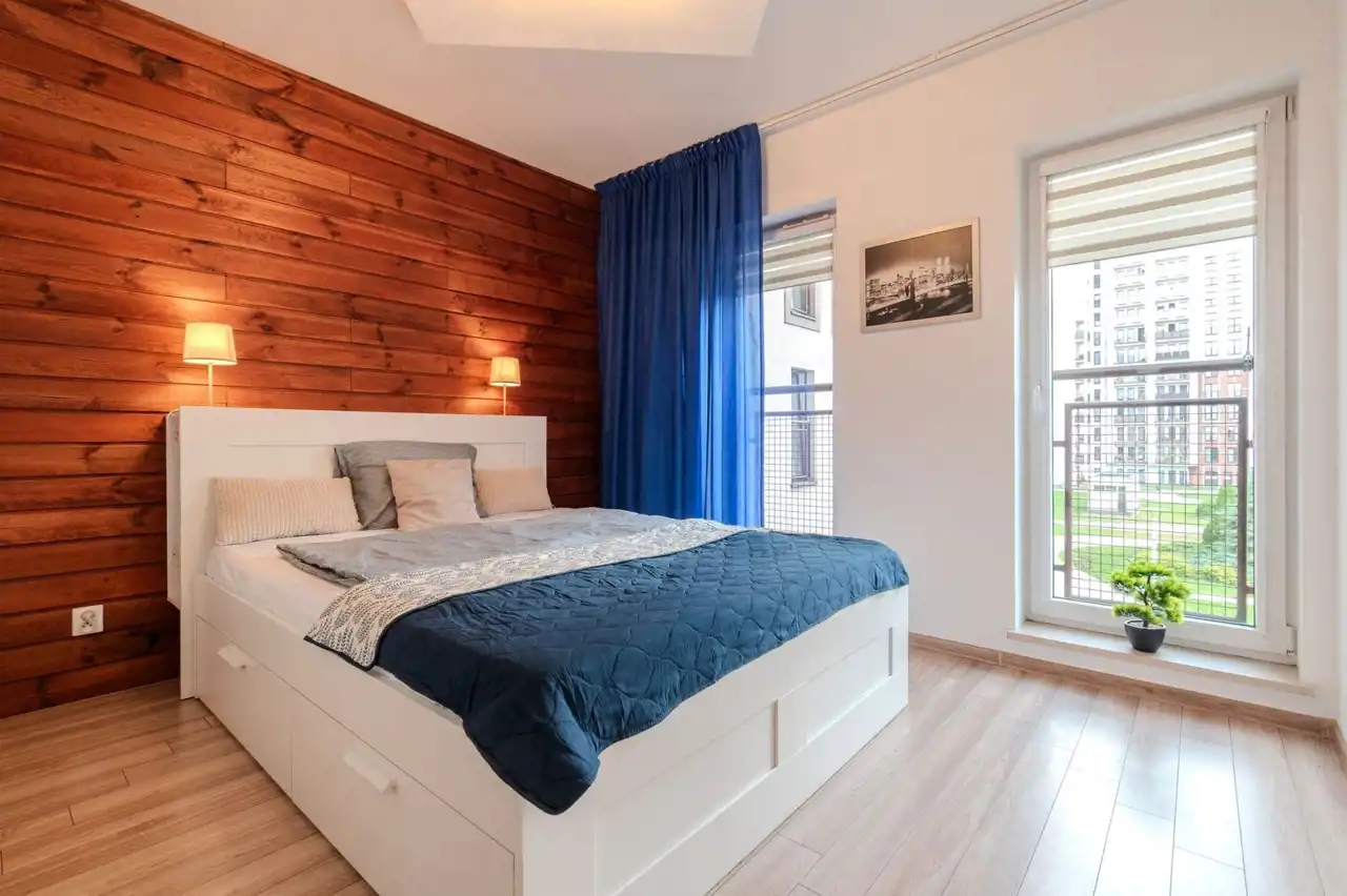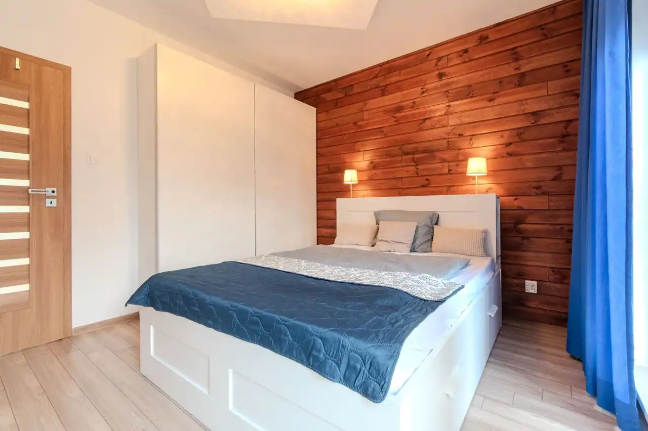 SYPIALNIA: duże łóżko sypialniane, szafki nocne, pojemna szafa.