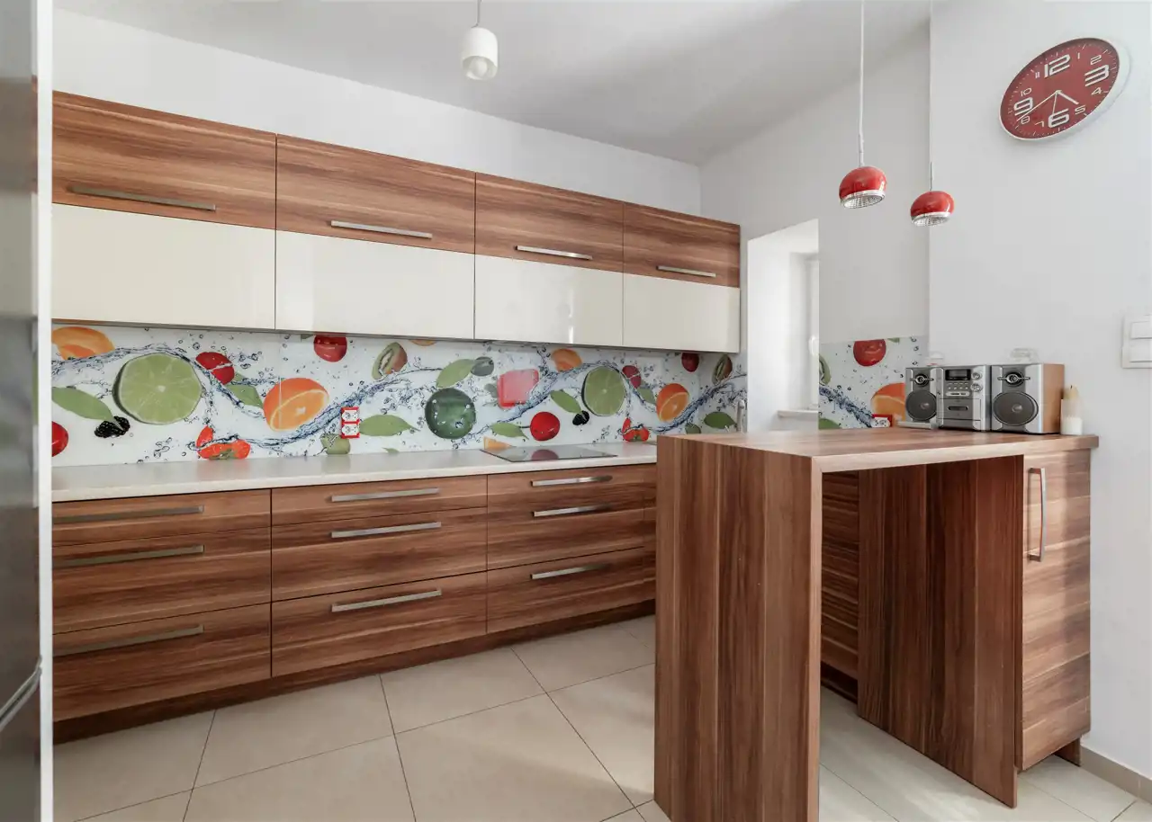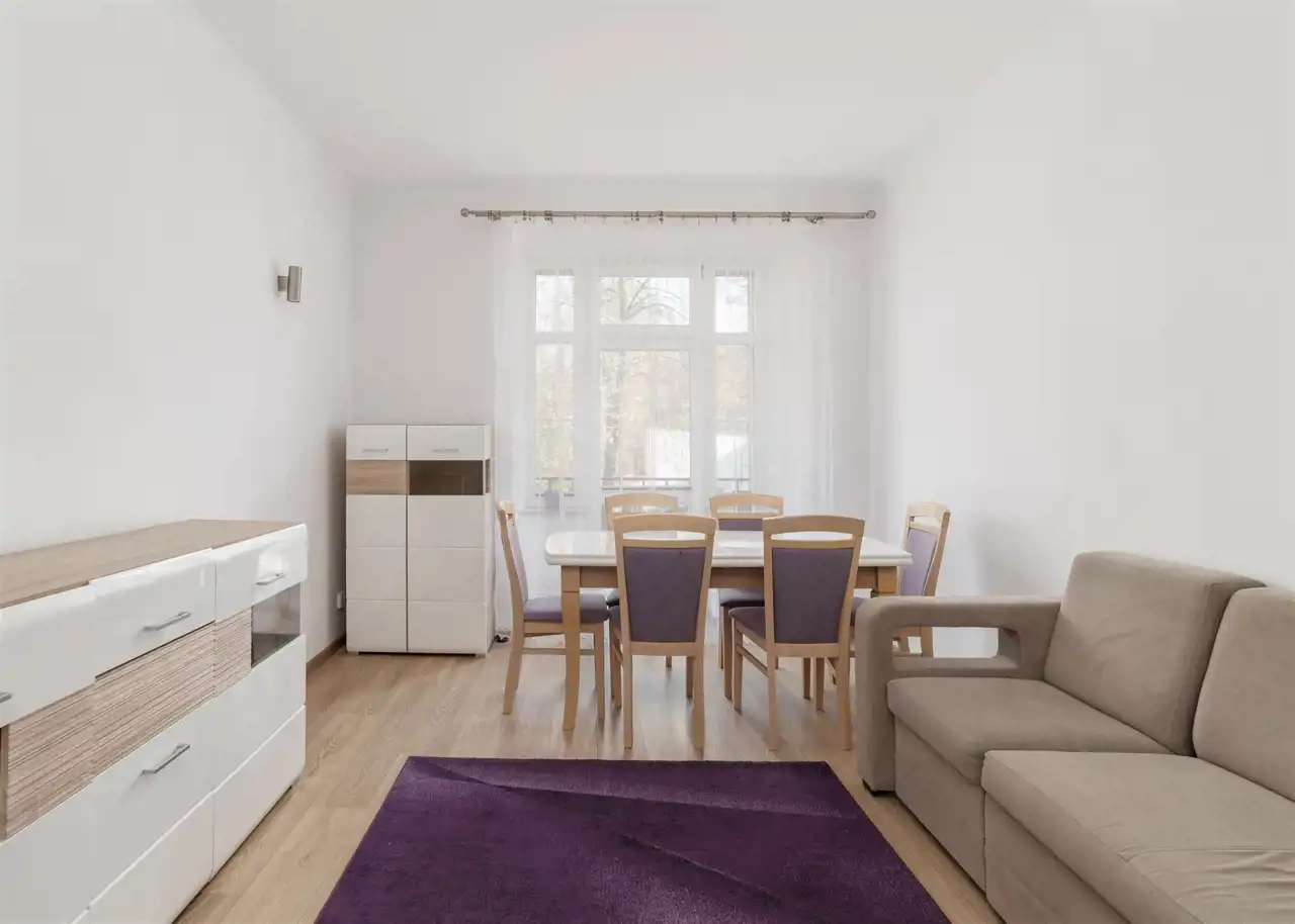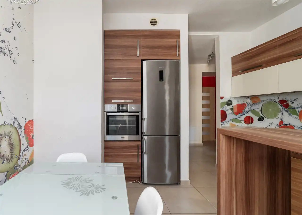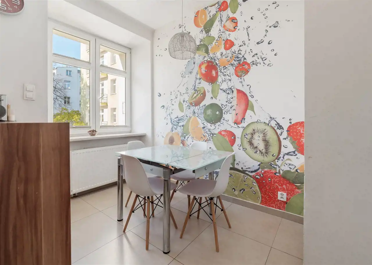 - oddzielną jasną kuchnię (wyposażoną w płytę indukcyjną, piekarnik, lodówko-zamrażarkę, zmywarkę) z wydzieloną, słoneczną jadalnią ze stołem i krzesłami;