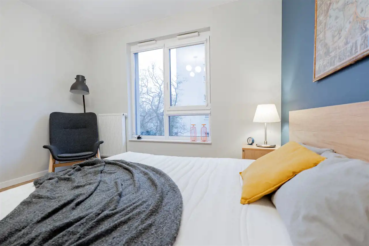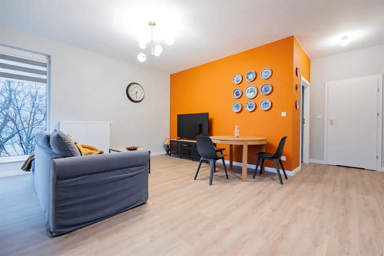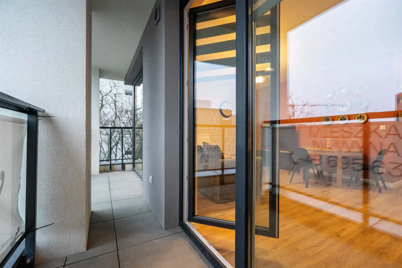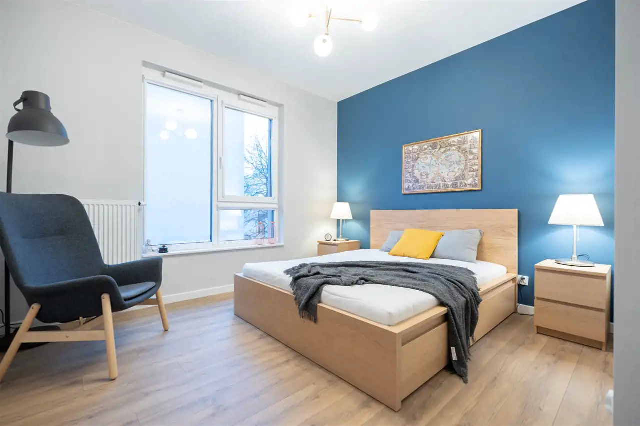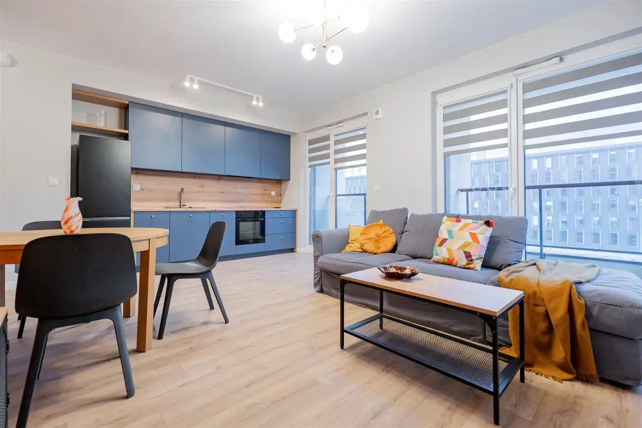 Apartament o powierzchni ok. 53 m2 składa się z salonu z aneksem kuchennym, sypialni, garderoby, przedpokoju oraz łazienki z WC. Do dyspozycji najemcy siłownia w budynku i strefa coworkingowa ze strefą do pracy.