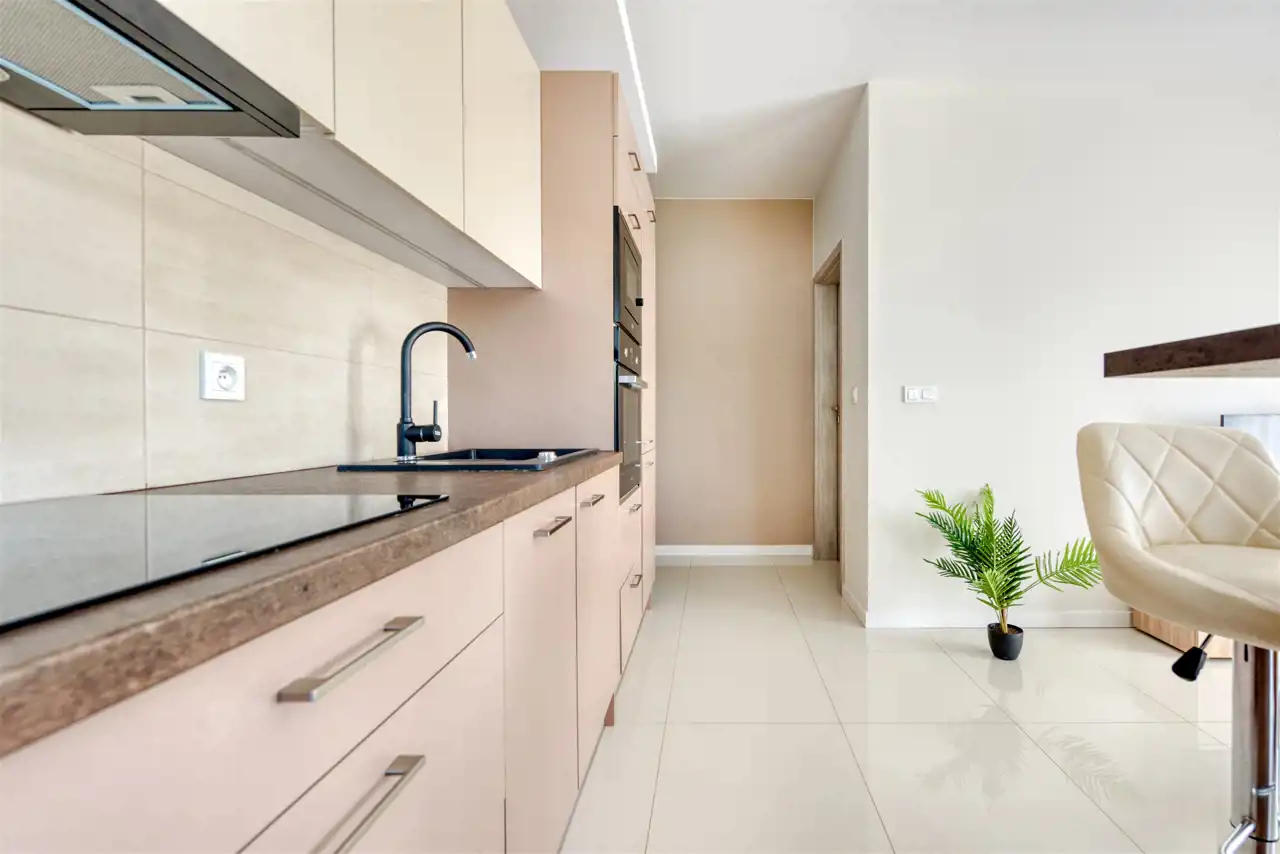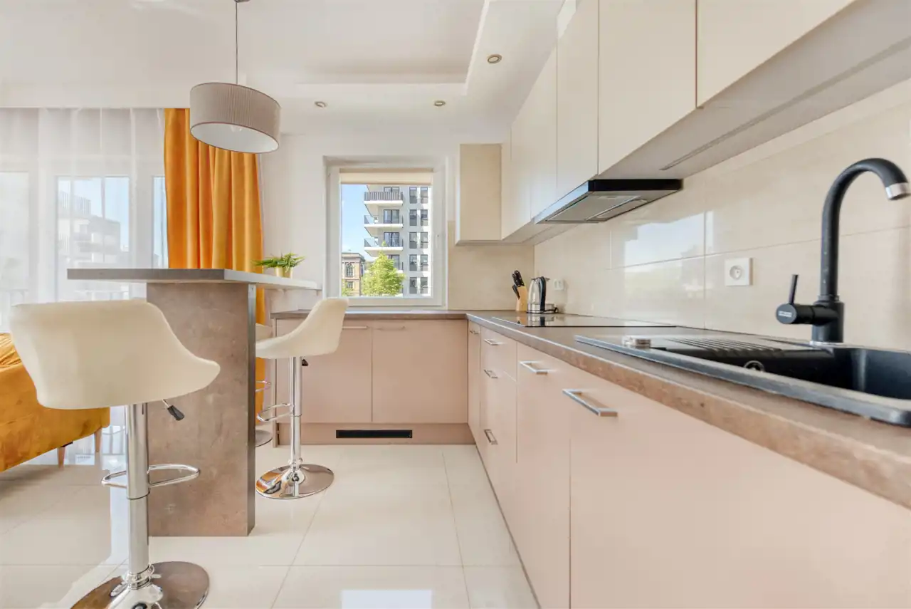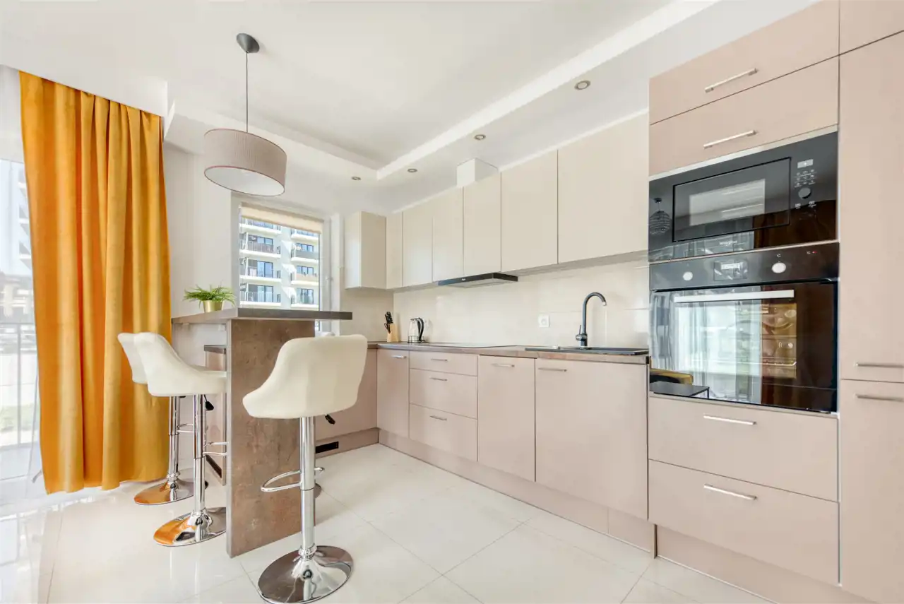 - kompletnie wyposażony aneks kuchenny (płyta indukcyjna, piekarnik, mikrofalówka, zmywarka, lodówko-zamrażarka);