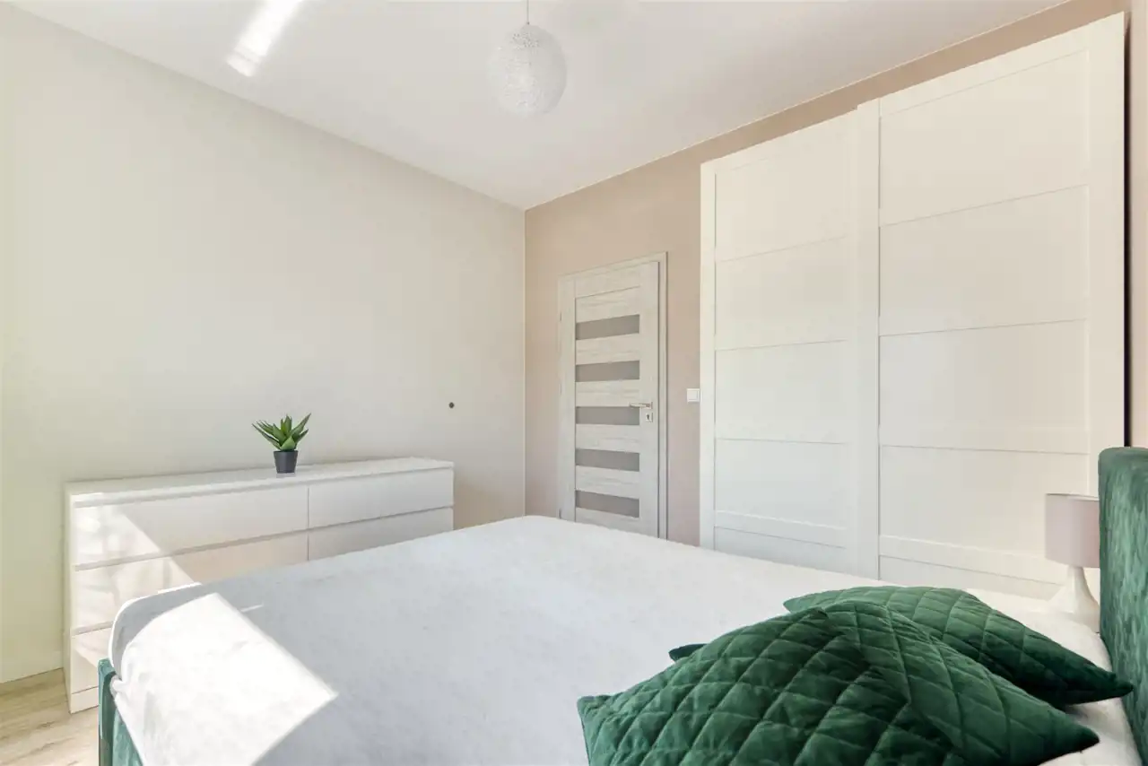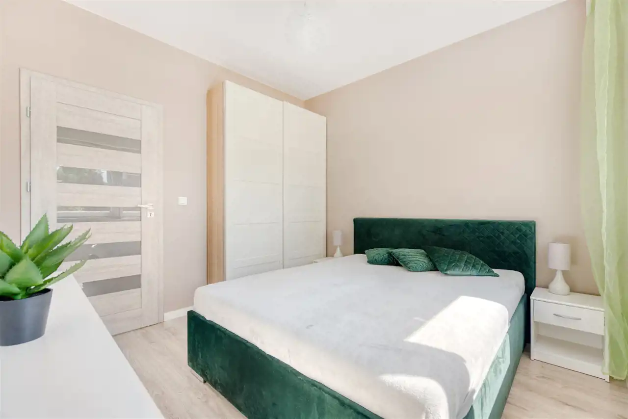 - przytulną sypialnię z dużym łóżkiem i szafą;