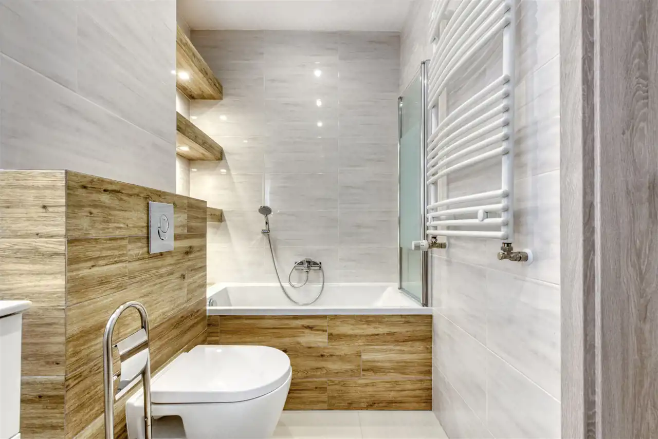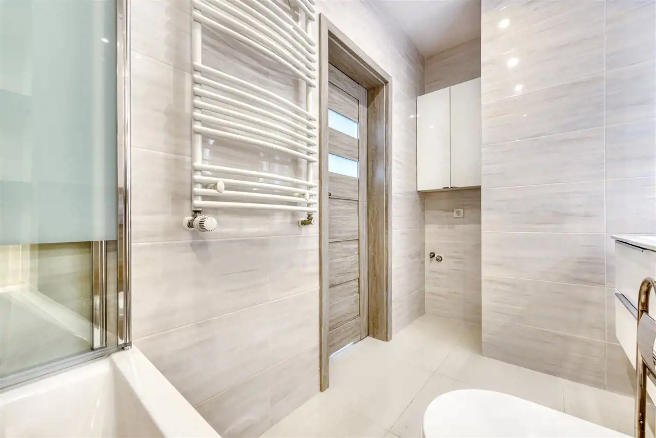 - świetnie zaprojektowaną łazienkę z WC wyposażoną w wannę z funkcją prysznica oraz pralkę;