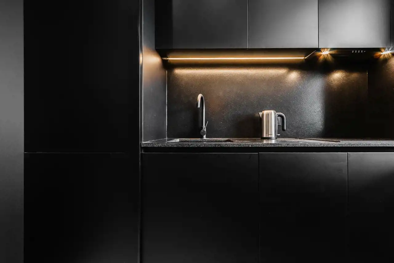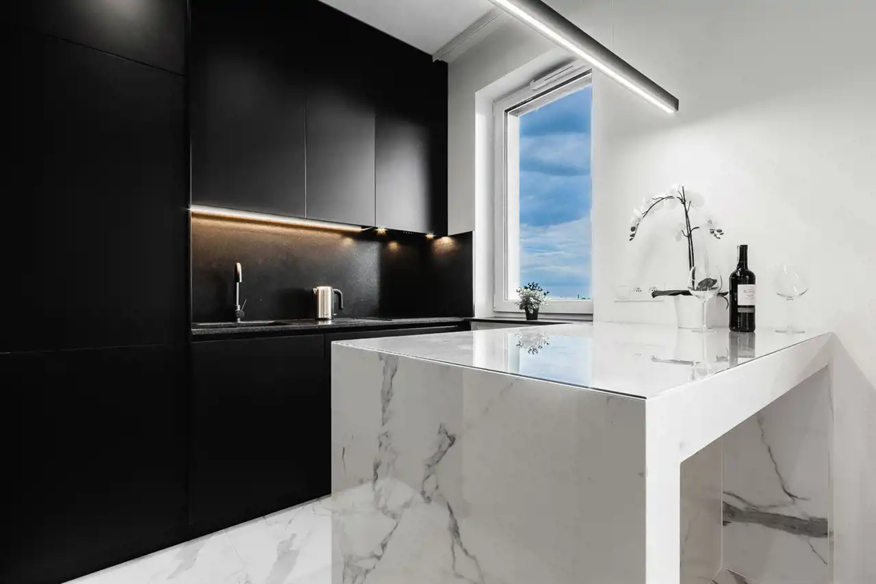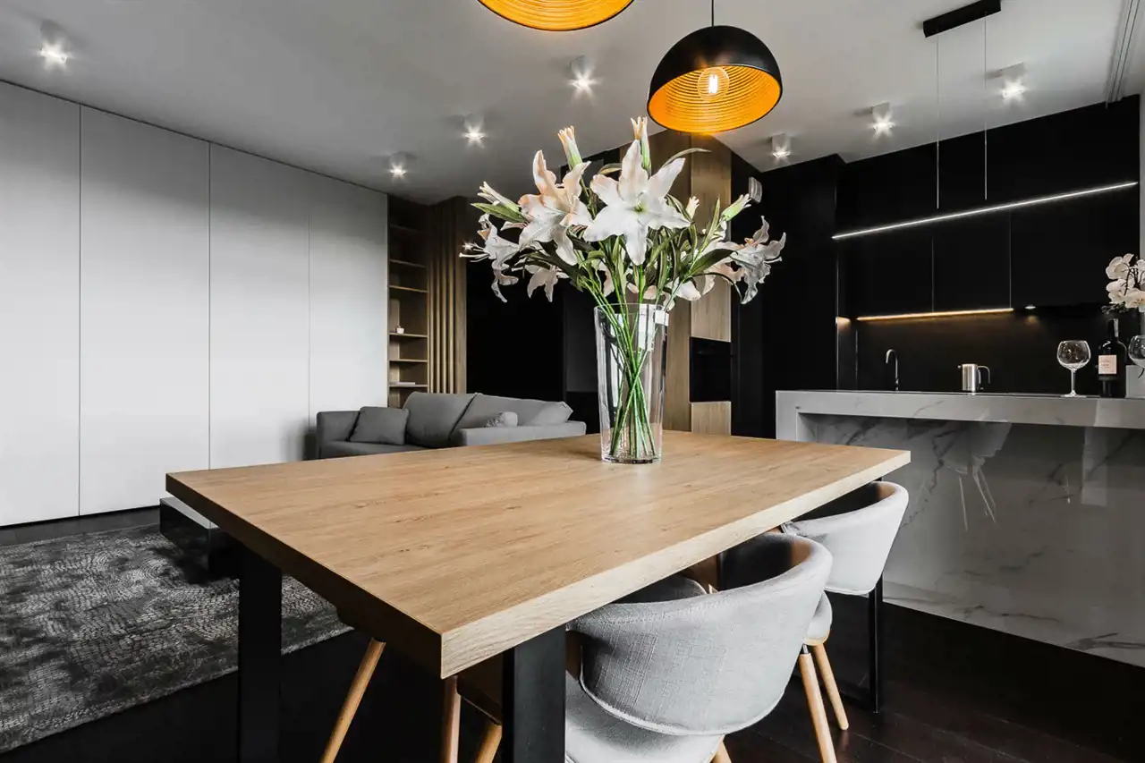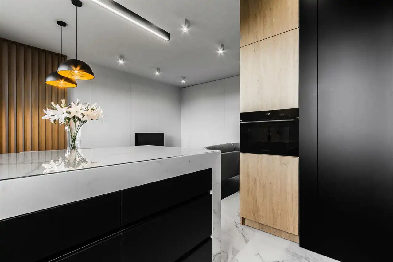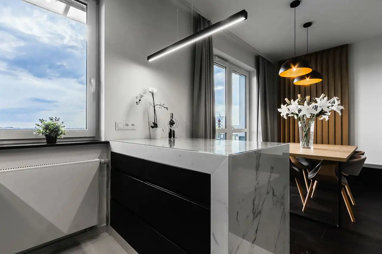 - aneks kuchenny wyposażony w płytę indukcyjną, okap, piekarnik, lodówkę z zamrażarką, zmywarkę;
