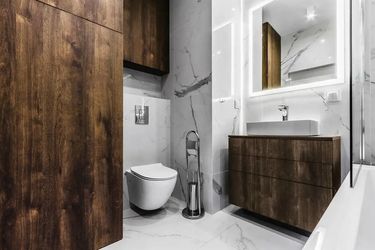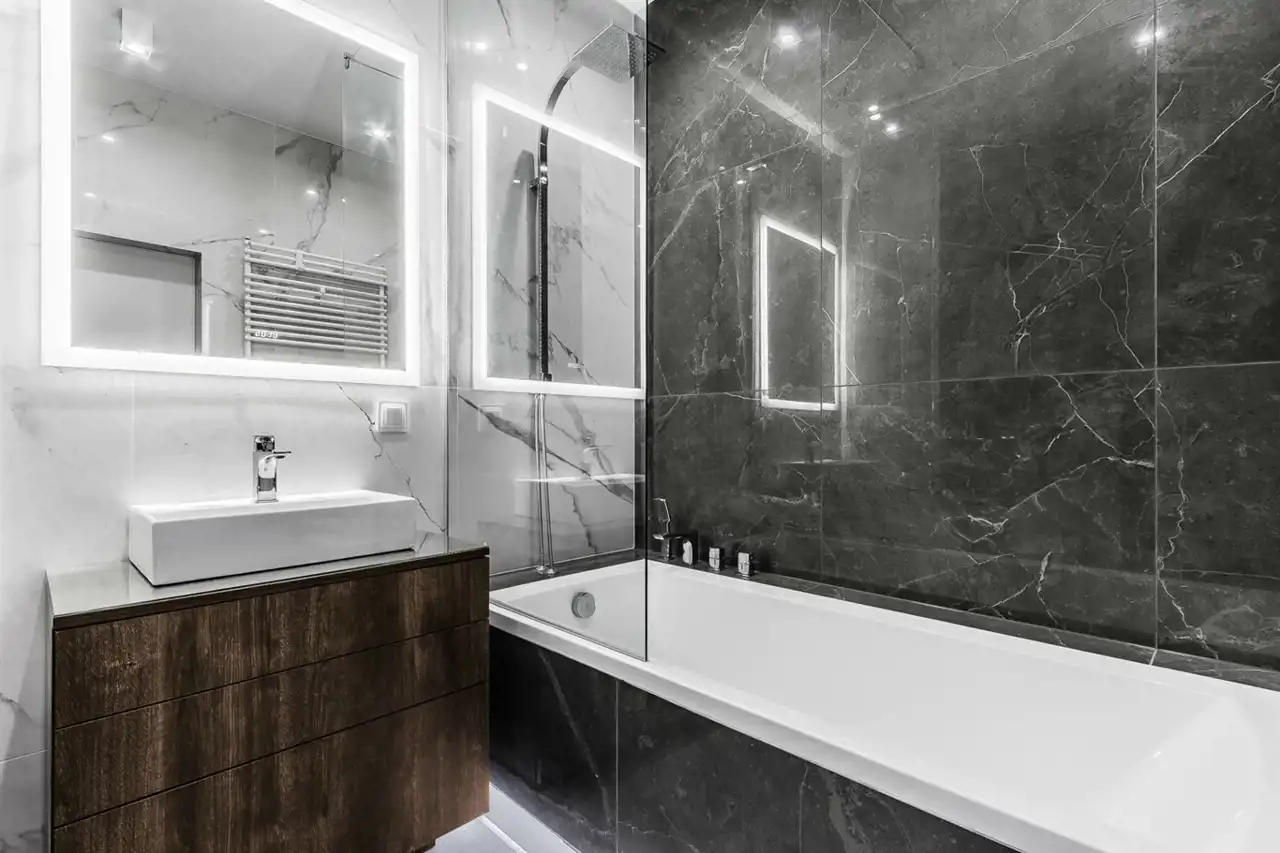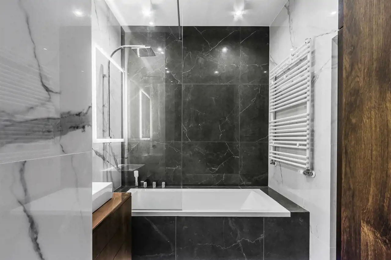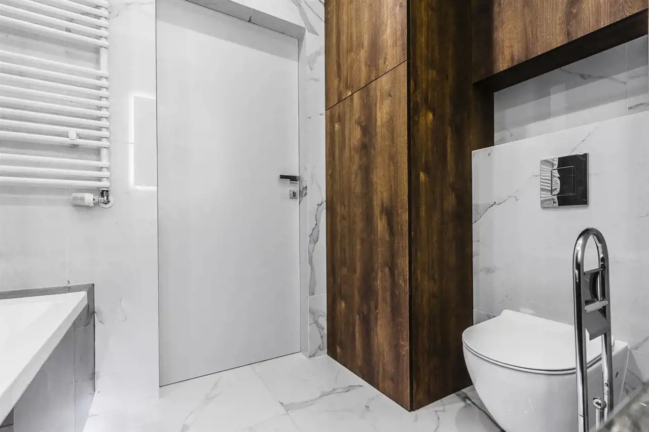 - nowoczesną łazienkę z WC wyposażoną w wannę z natryskiem oraz pralkę;