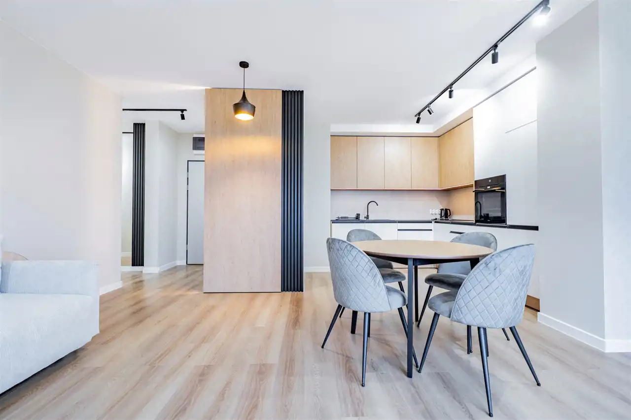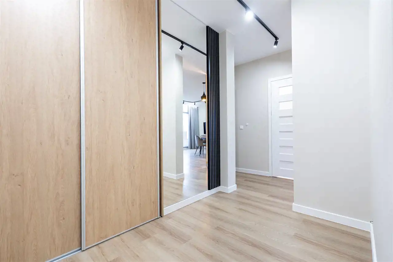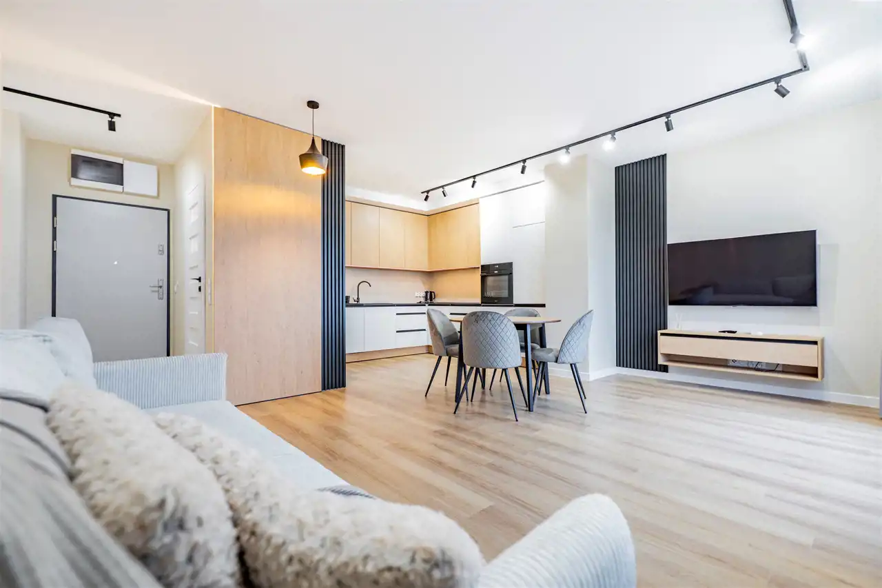Apartament składa się z 3 pokoi: salonu z aneksem kuchennym, 2 sypialni, łazienki, WC oraz przedpokoju. Mieszkanie do pierwszego zamieszkania. Wszystkie sprzęty oraz wyposażenie nowe. Mieszkanie klimatyzowane. Atutem mieszkania jest duża przestrzeń do przechowywania oraz bliskość terenów zielonych. Całość wykończona bardzo gustownie przy użyciu materiałów wysokiej jakości. Mieszkanie klimatyzowane.