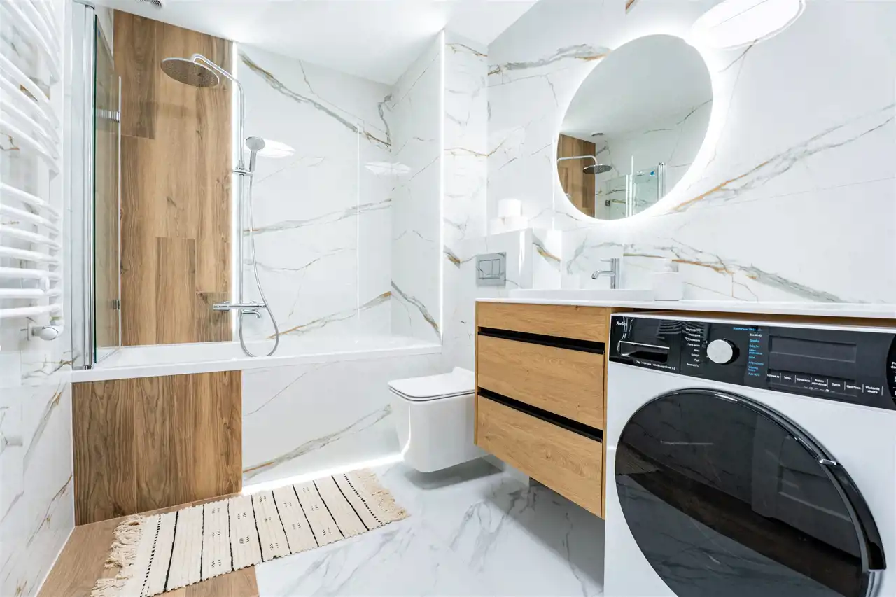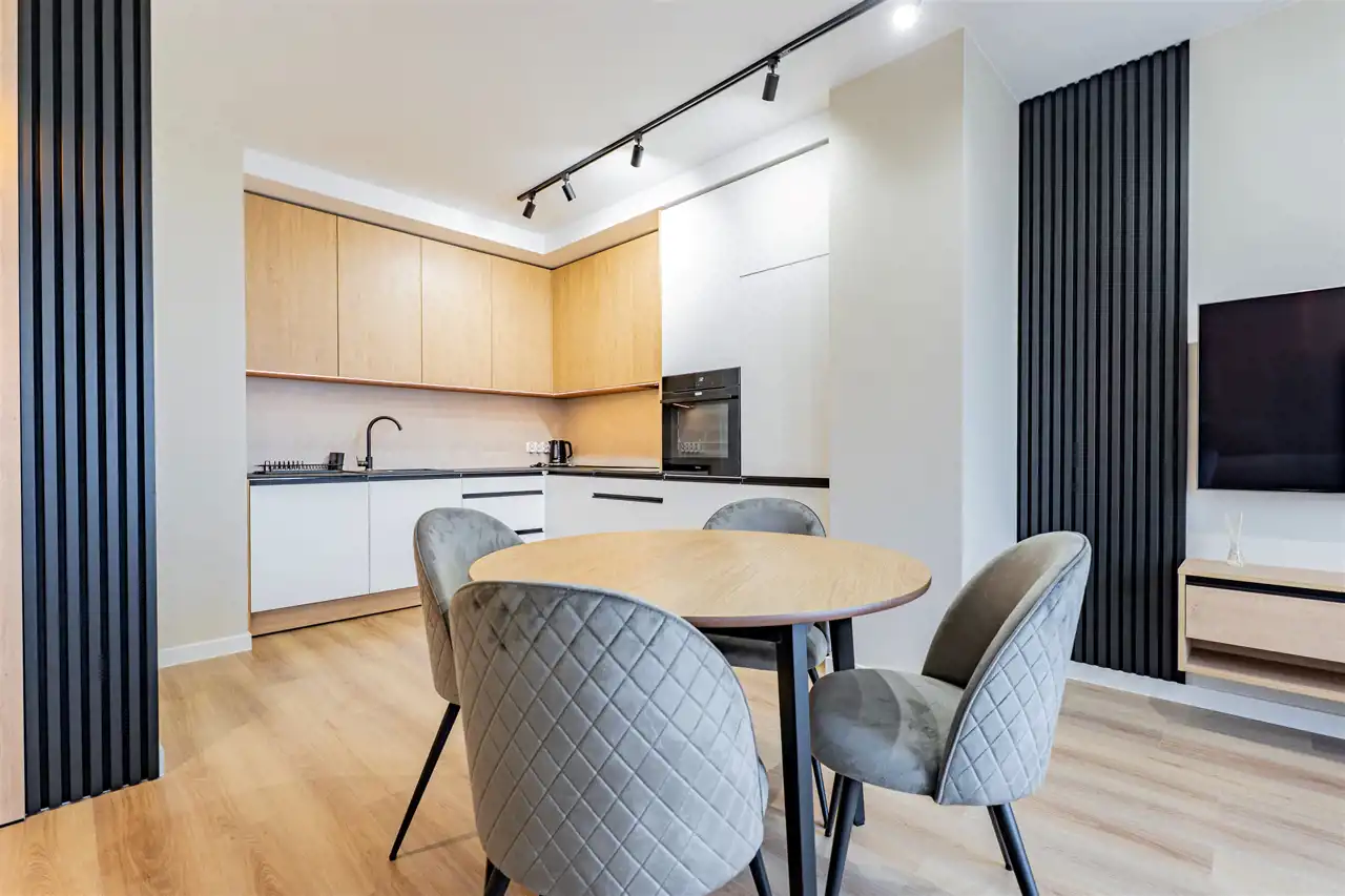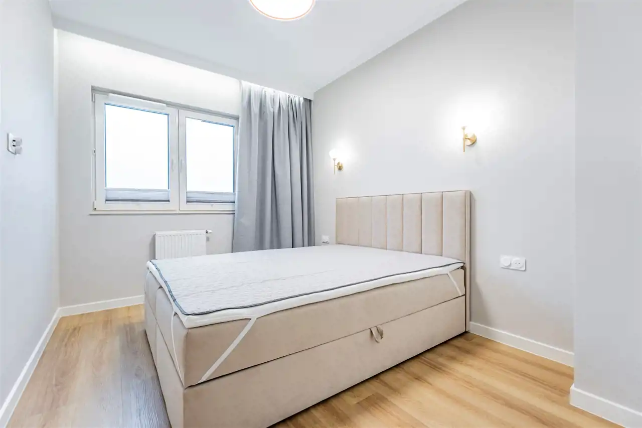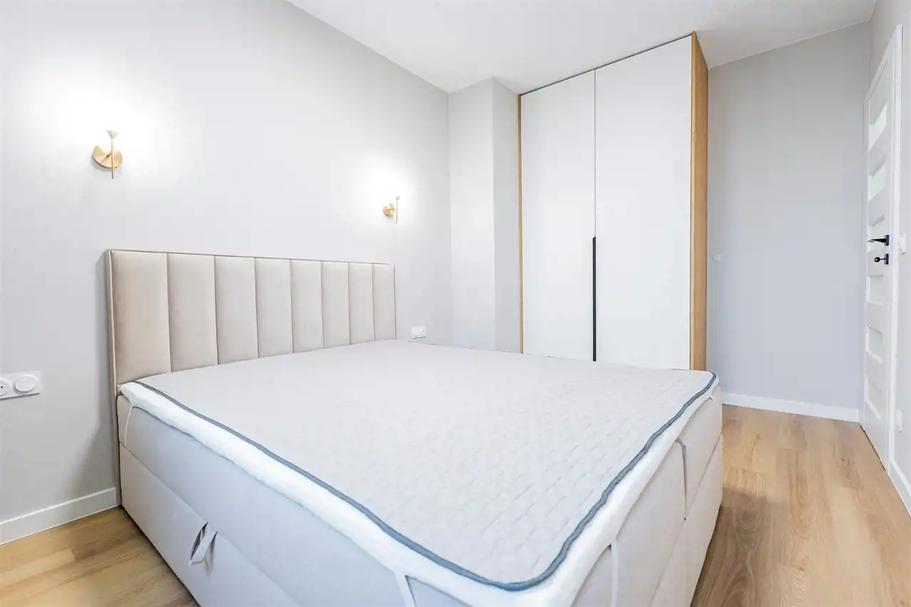 Apartament został wykończony w nowoczesny, niebanalny sposób przez architekta. W salonie znajdziemy wygodną rozkładaną sofę, szafkę RTV, telewizor oraz stół z krzesłami. Aneks kuchenny wyposażony w lodówko-zamrażarkę, zmywarkę, piekarnik, płytę indukcyjną. W sypialni znajduje się dwuosobowe łóżko oraz pakowna szafa. Drugi pokój może zostać zaadaptowany przez najemcę na gabinet lub sypialnię. Toaleta z wanną z funkcją prysznica, umywalką, pralką oraz oddzielne WC. Dodatkowo w przedpokoju znajduje się pakowna szafa z licznym miejscem do przechowywania.