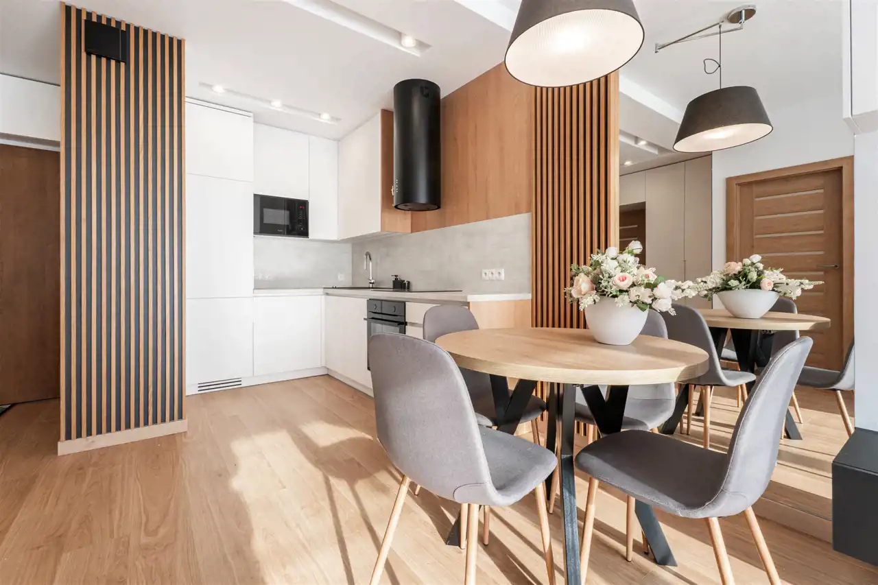 Mieszkanie wykończone w wysokim standardzie, z dbałością o każdy szczegół. Liczne punkty świetlne nadają przytulnego klimatu, doskonale doświetlając przestrzeń.