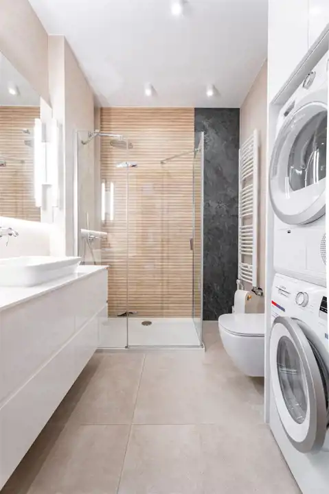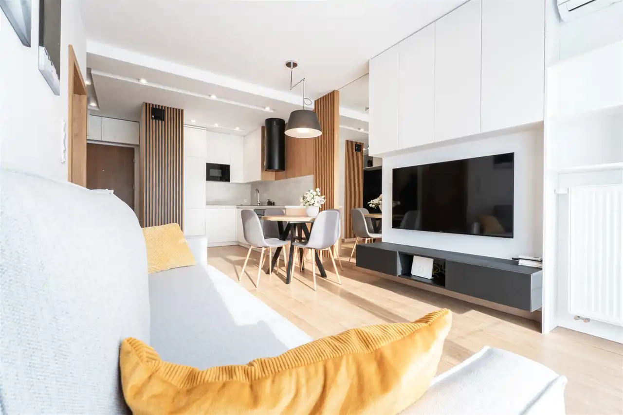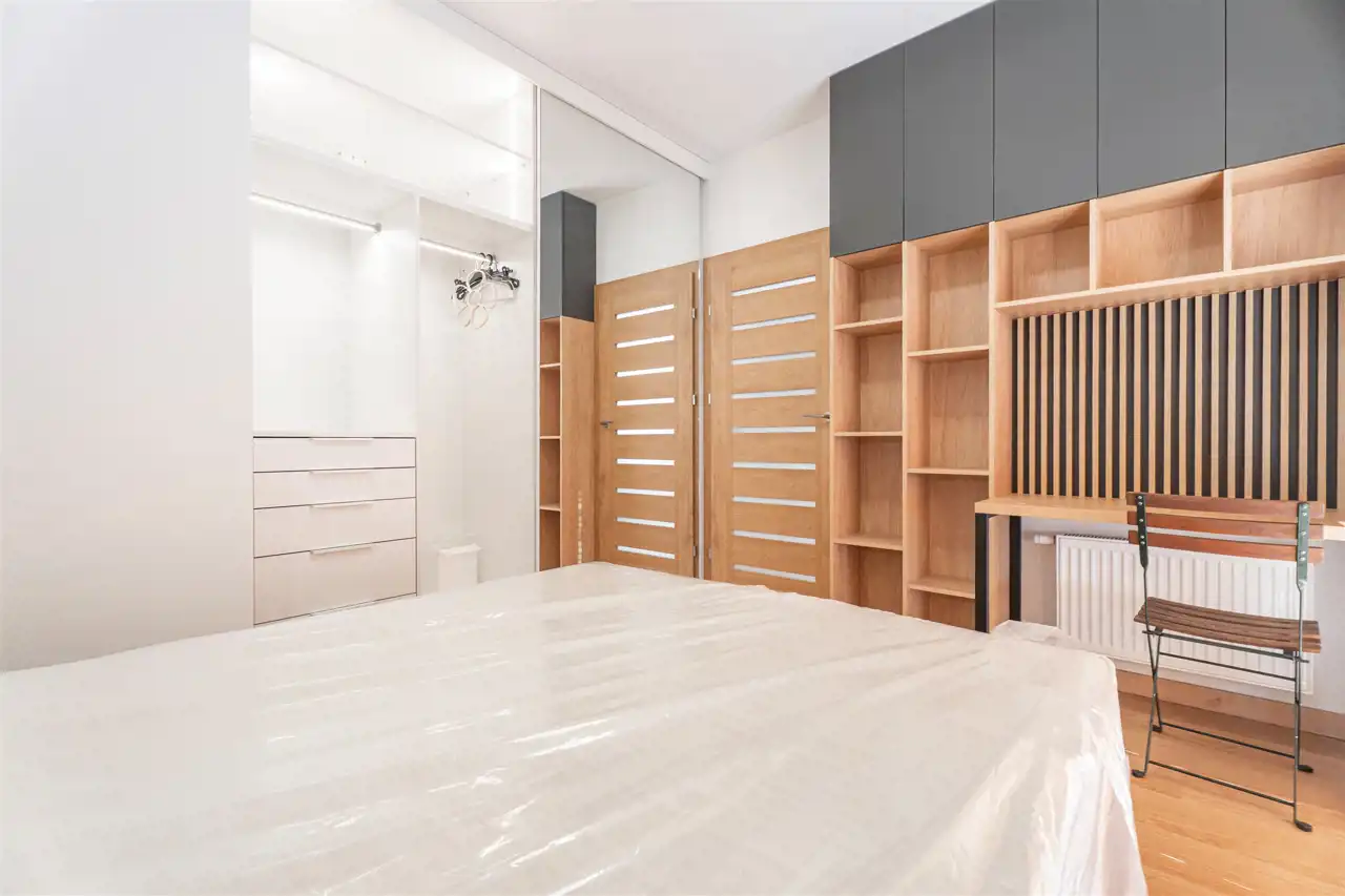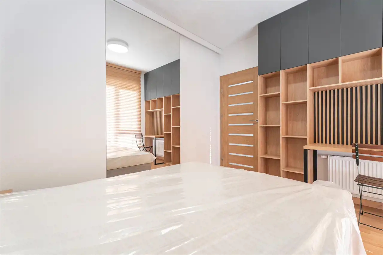 Mieszkanie w pełni wyposażony - w salonie znajdziemy komfortową kanapę, szafkę RTV wraz z zabudową, telewizor, rozkładany stół z krzesłami, regał. Aneks kuchenny wyposażony we wszystkie niezbędne sprzęty m.in. lodówkę z zamrażarką, zmywarkę, płytę indukcyjna, piekarnik elektryczny. Zabudowa kuchenna posiada liczne, pojemne szafki na przechowywanie. W sypialni znajdziemy łóżko 160/200, pakowną szafę, regał na książki, szafki w zabudowie oraz biurko. Łazienka wyposażona została w prysznic z deszczownicą, umywalkę z szafką, toaletę oraz pralkę i suszarkę. W przedpokoju dodatkowa szafa oraz szafki w zabudowie, dzięki czemu mieszkanie jest funkcjonale i posiada dużą przestrzeń na przechowywanie.