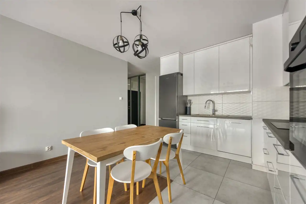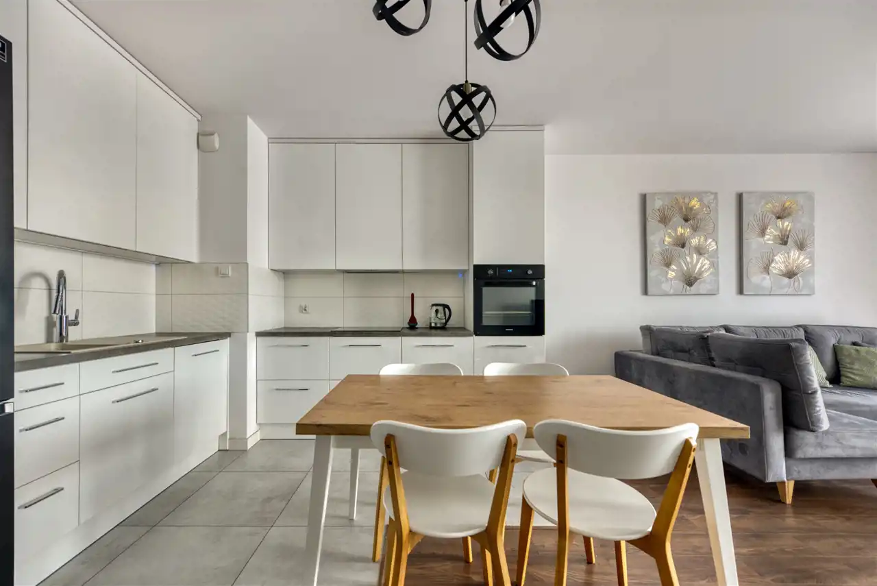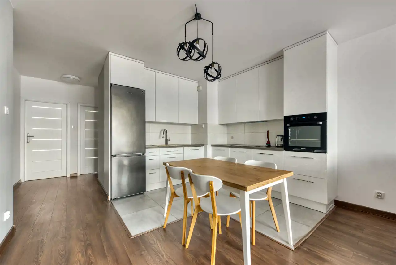 - kompletnie wyposażony aneks kuchenny (płyta indukcyjna, piekarnik, zmywarka, lodówko-zamrażarka, okap);