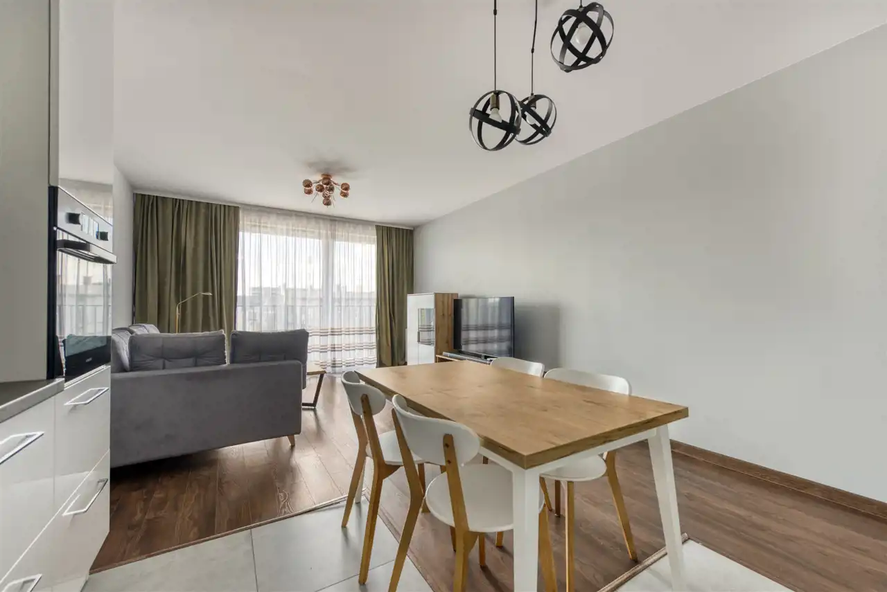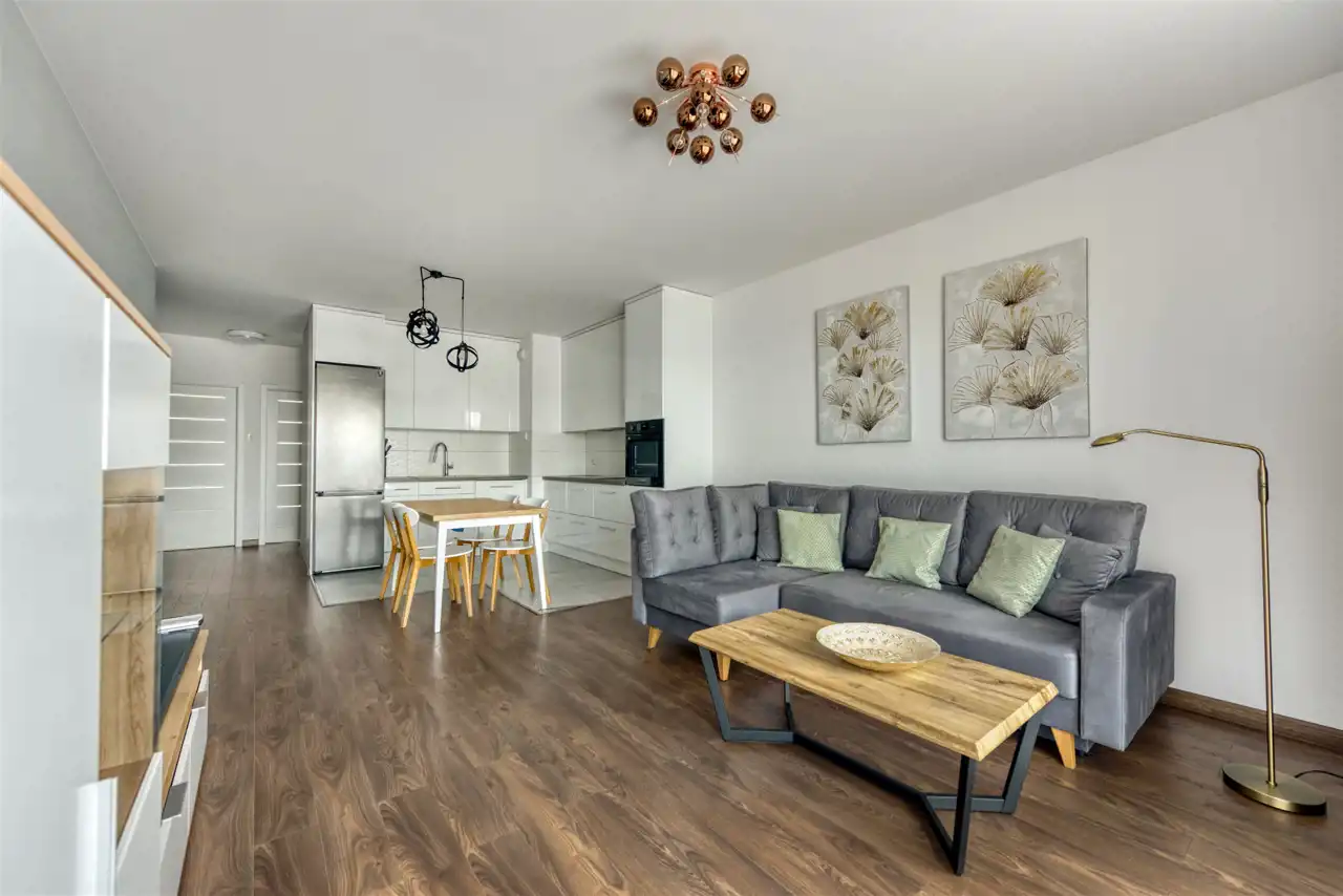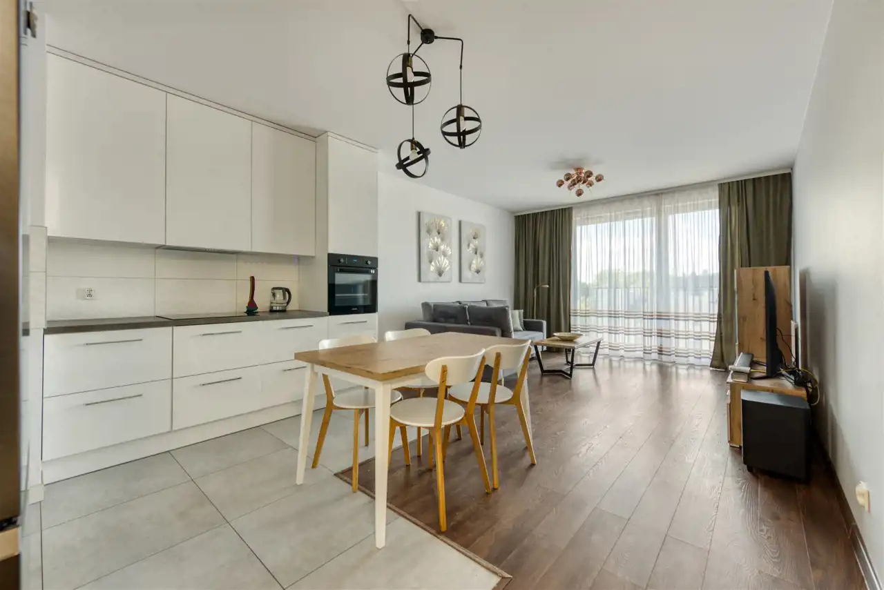 - kompletnie wyposażony aneks kuchenny (płyta indukcyjna, piekarnik, zmywarka, lodówko-zamrażarka, okap);