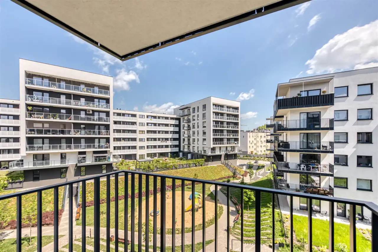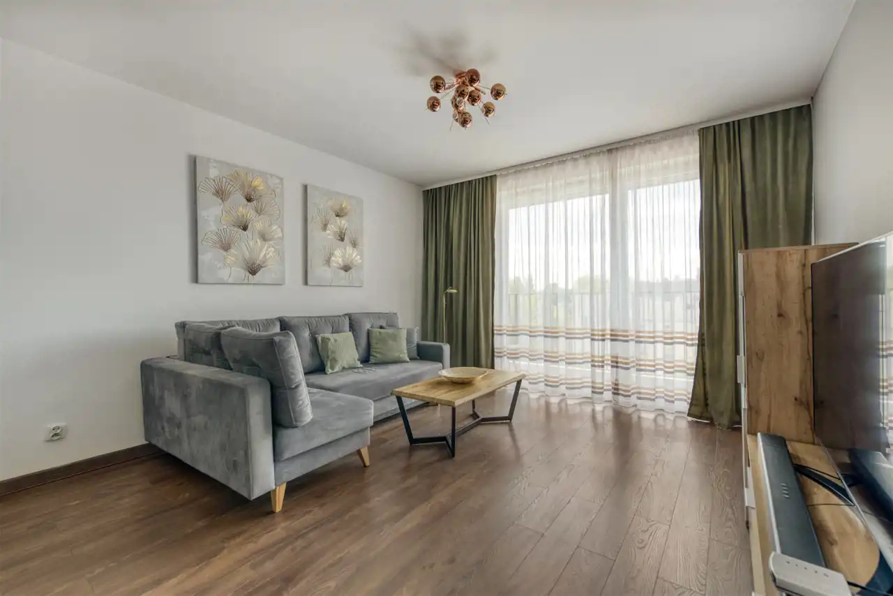 - przestronny pokój dzienny (wyposażony w sofę, stolik kawowy, szafkę RTV, stół i krzesła) z wyjściem na balkon;