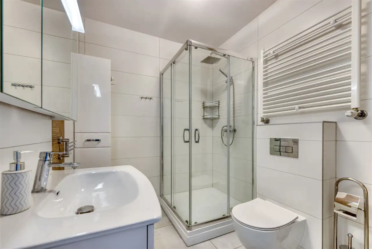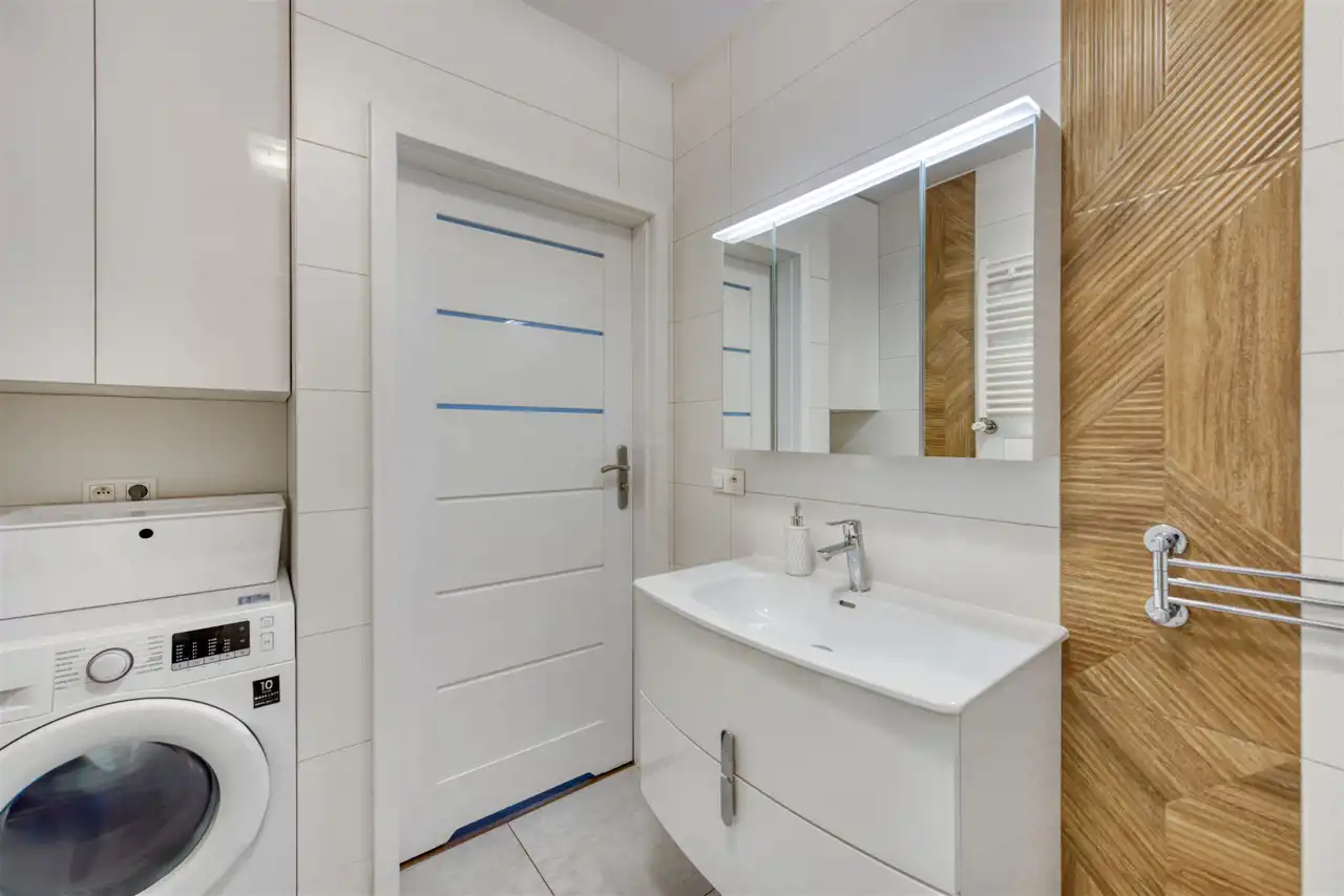 - łazienkę z WC wyposażoną w dużą kabinę prysznicową oraz pralkę;