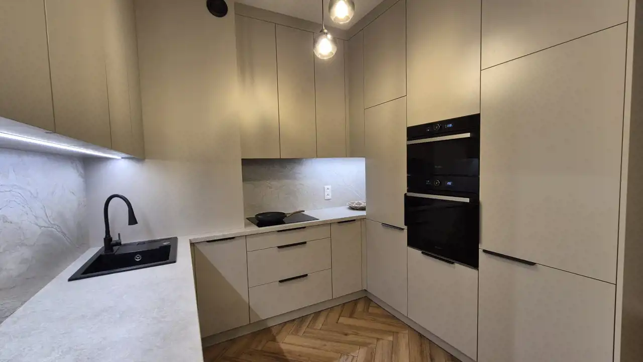 W salonie znajdziemy wygodną sofę, szafkę RTV, telewizor, oraz stół z krzesłami. Aneks kuchenny wyposażony w lodówko-zamrażarkę, zmywarkę, piekarnik, płytę indukcyjną. W sypialni znajduje się dwuosobowe łóżko oraz pakowna szafa. Toaleta z prysznicem typu walk-in, umywalką, pralką oraz WC. Dodatkowo w garderobie oraz przedpokoju znajdują się pakowne szafy z licznym miejscem do przechowywania.