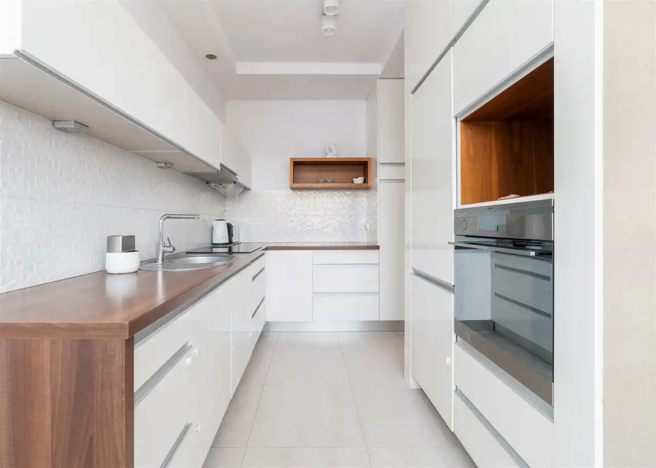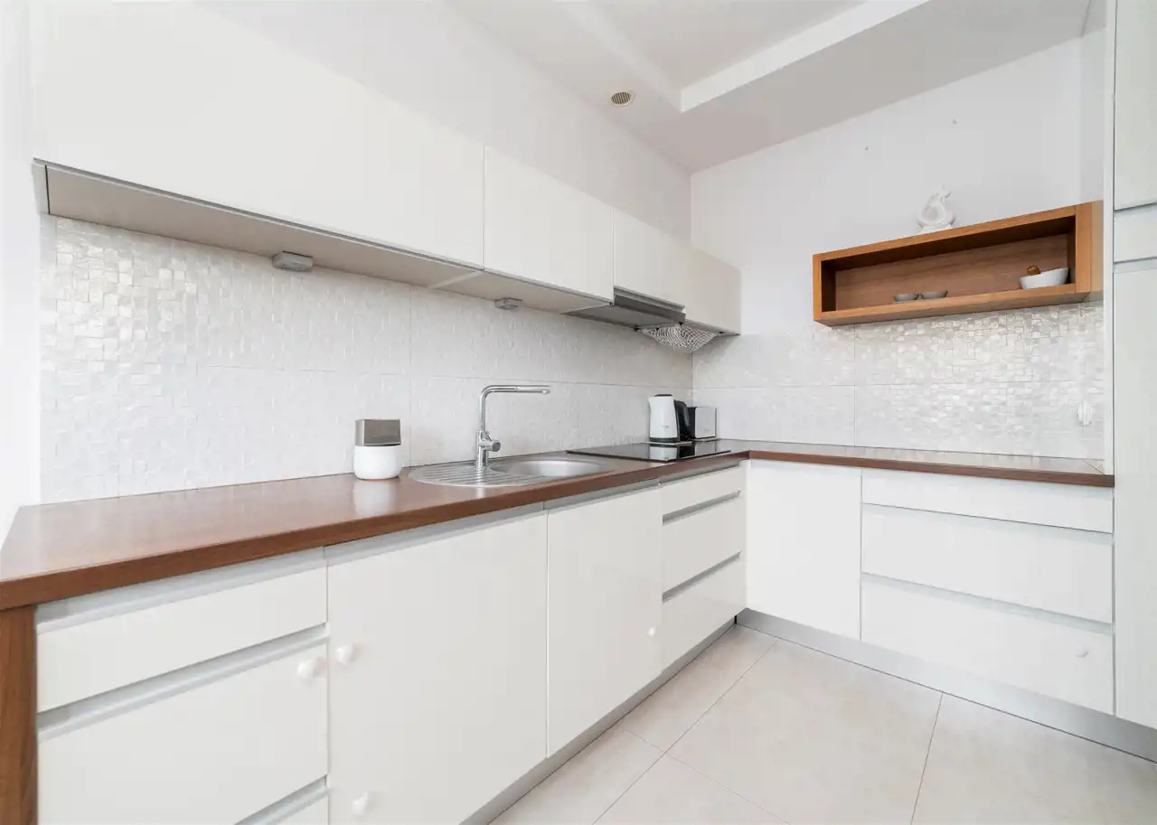 - otwartą, nowoczesną kuchnię wyposażoną w płytę elektryczną, okap, piekarnik, lodówkę z zamrażarką oraz zmywarkę;