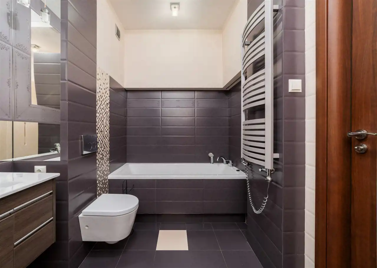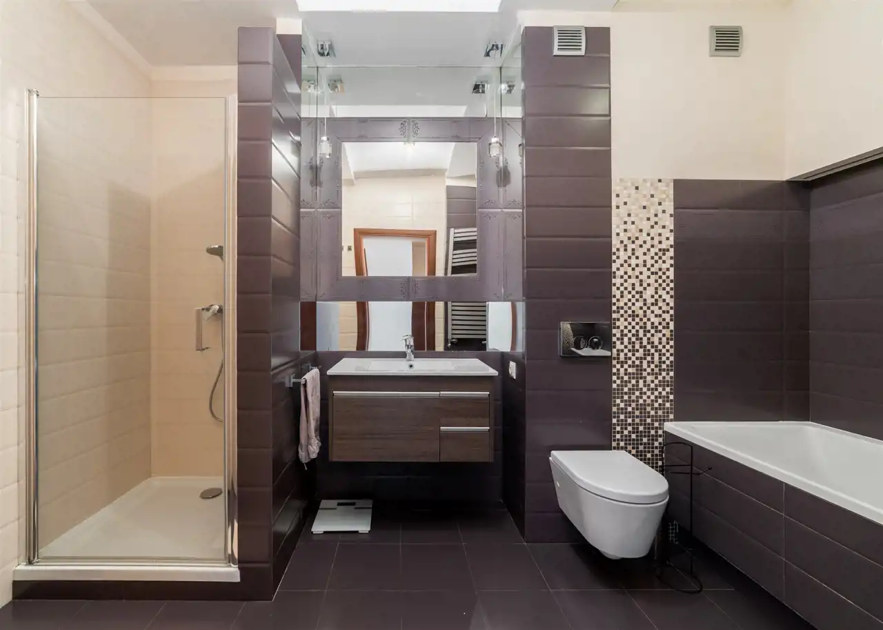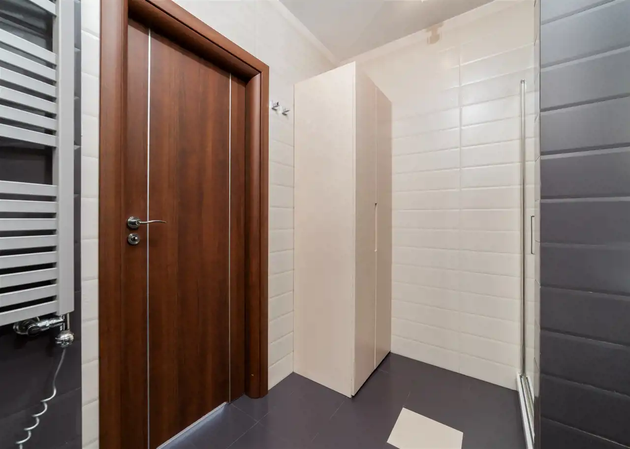 - nowoczesną łazienkę wyposażoną w prysznic, wannę oraz pralkę;