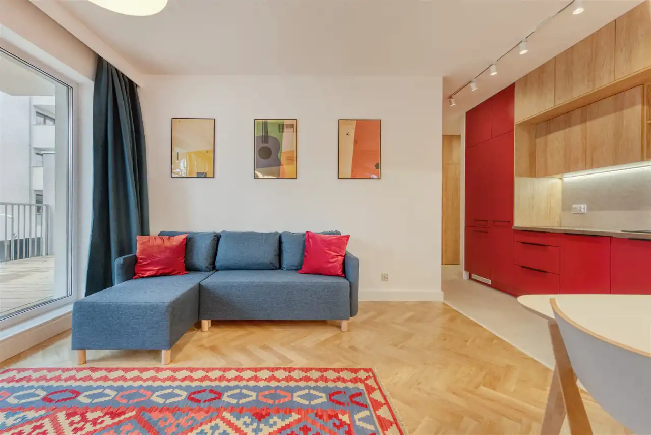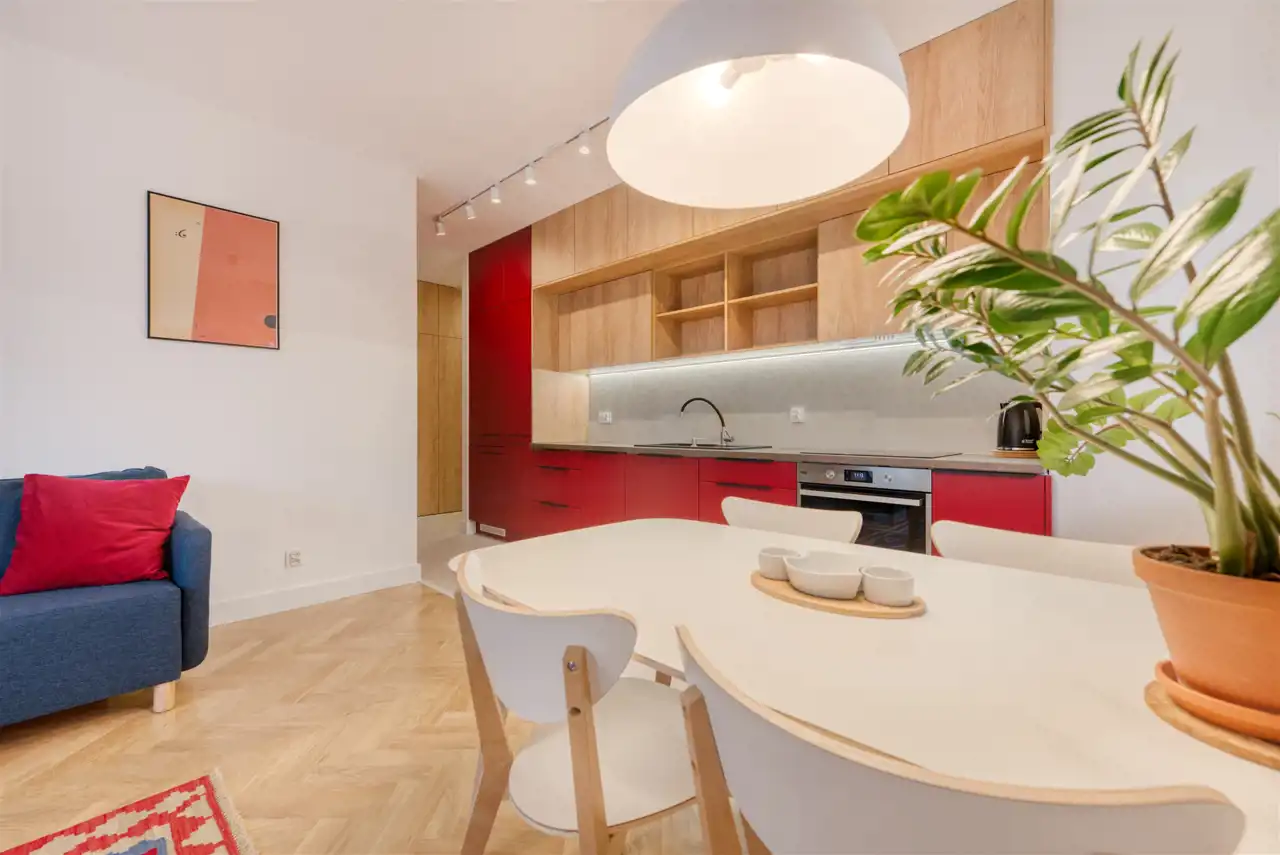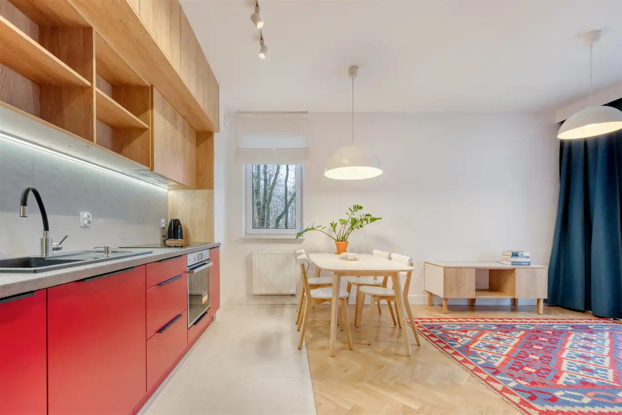- funkcjonalny aneks kuchenny (wyposażony w płytę indukcyjną, okap, piekarnik, lodówko-zamrażarkę i zmywarkę);