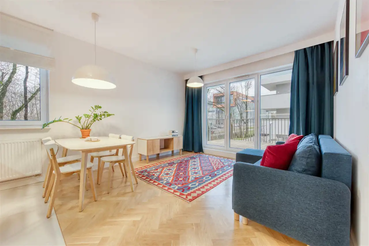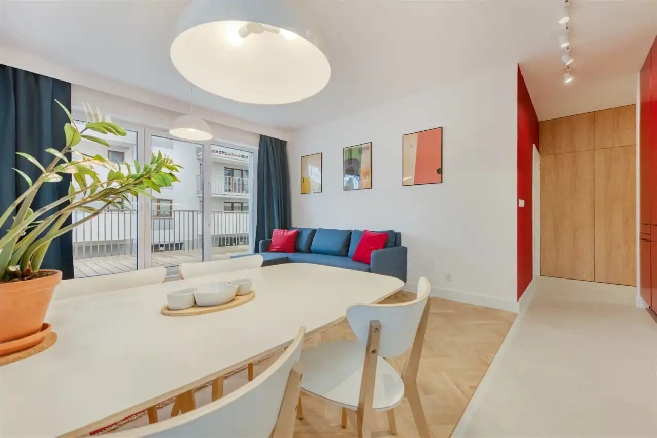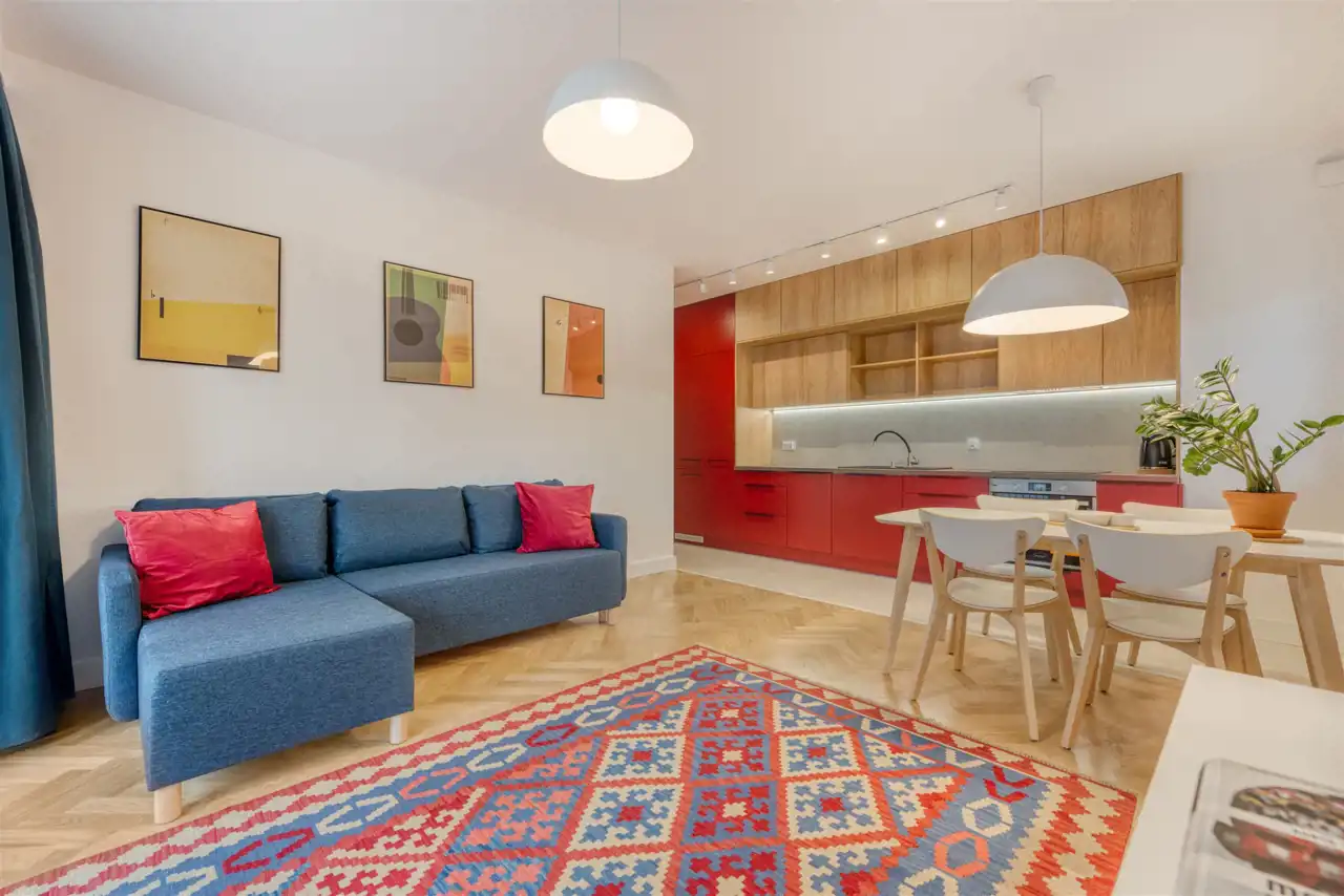 - funkcjonalny aneks kuchenny (wyposażony w płytę indukcyjną, okap, piekarnik, lodówko-zamrażarkę i zmywarkę);