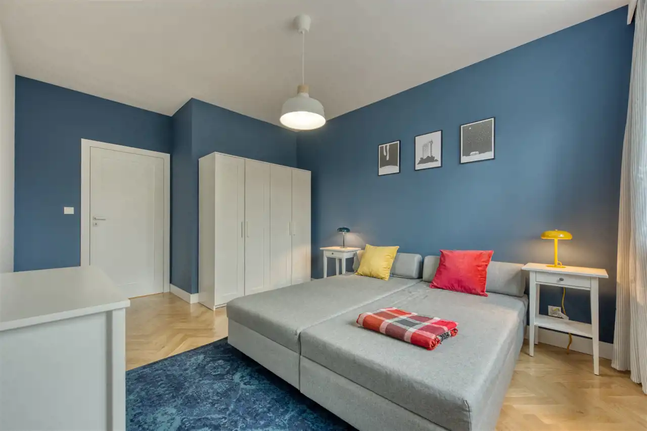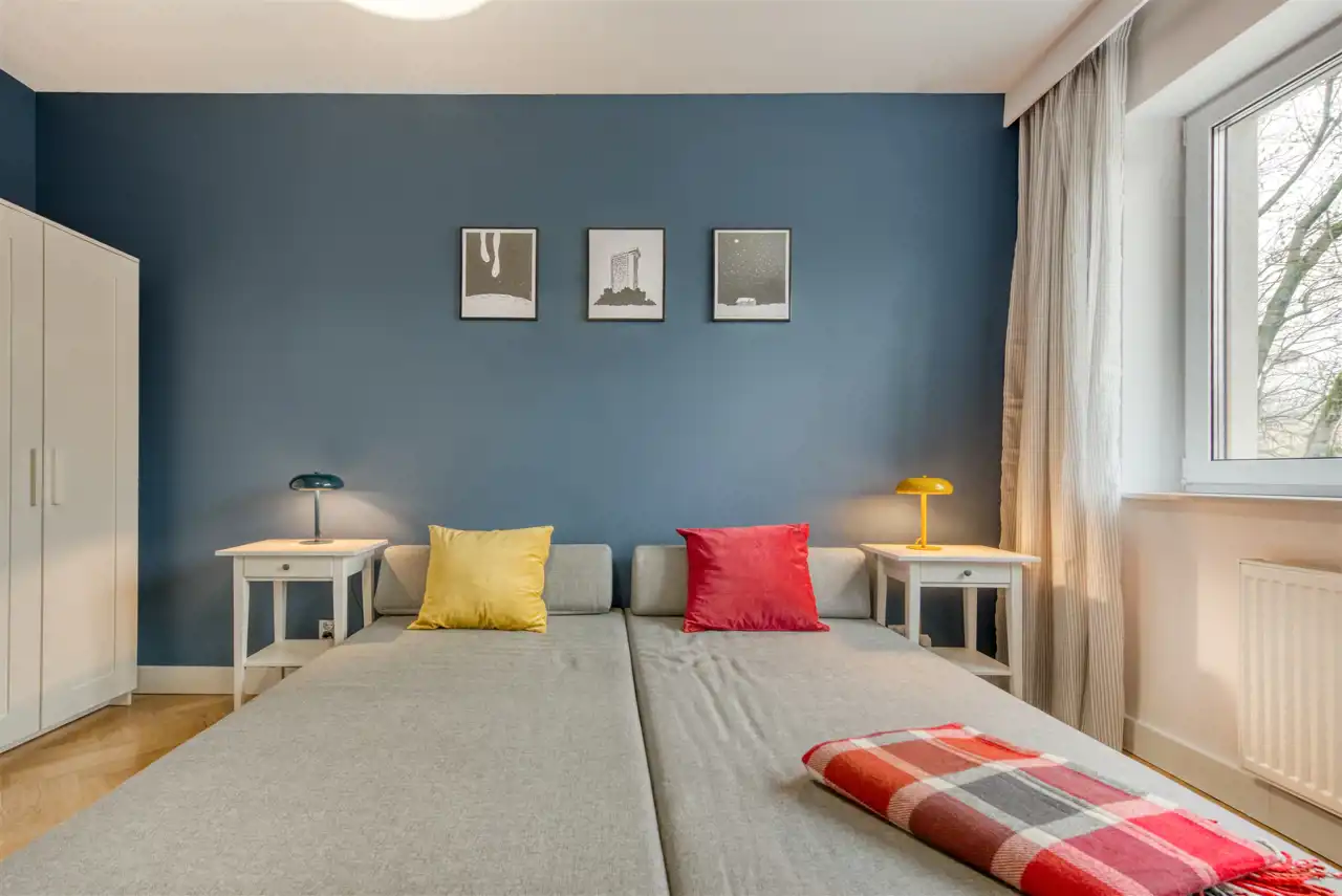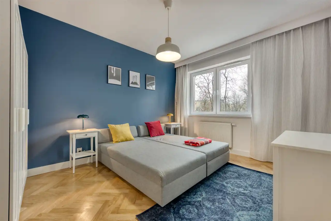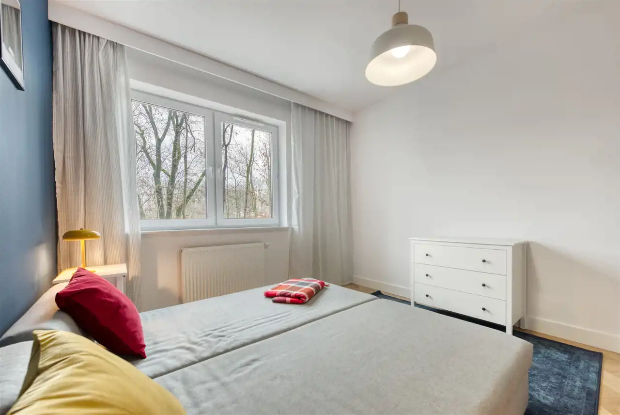 - przytulną sypialnię (wyposażoną w podwójne łóżko, pojemną szafę i komodę);