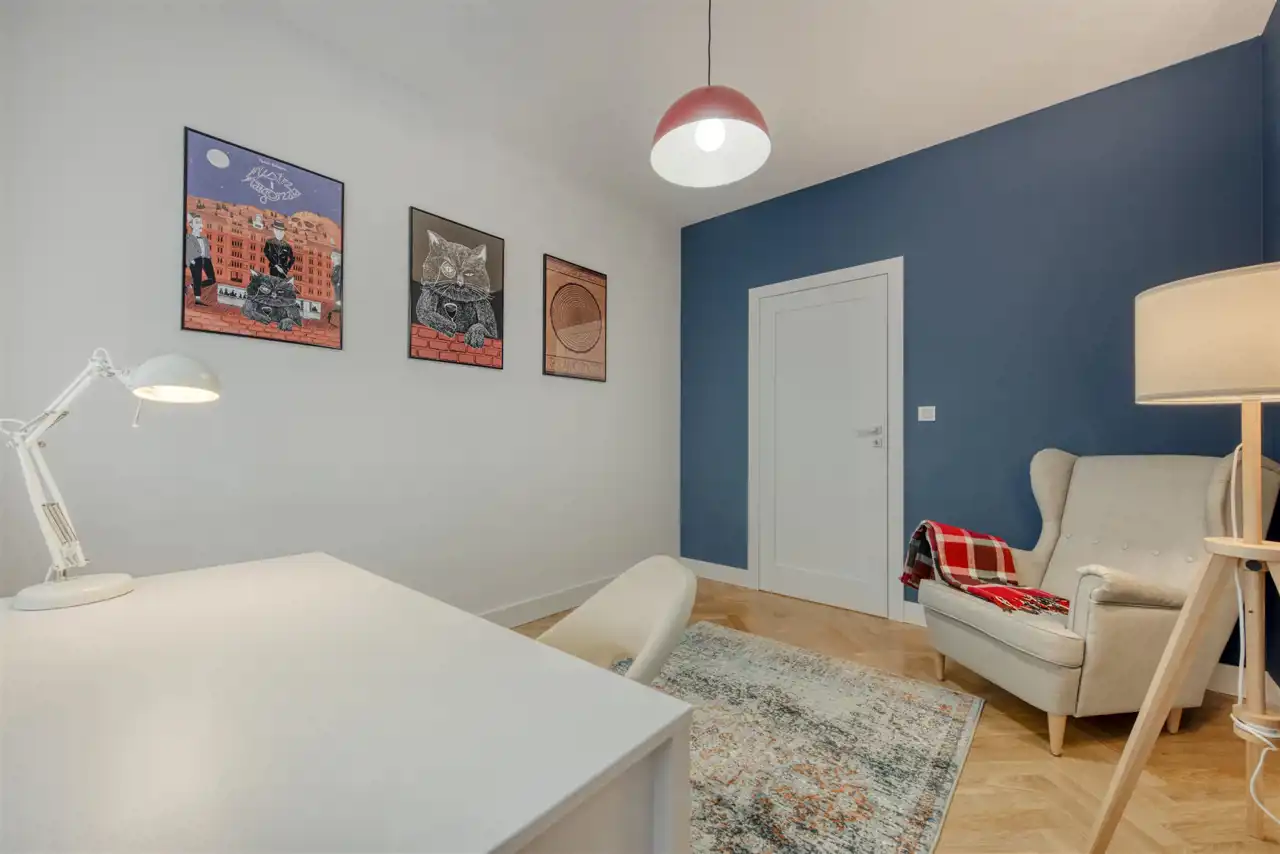 - pokój mogący pełnić funkcję gabinetu, dodatkowej sypialni lub pokoju dla dziecka (wyposażony w biurko z krzesłem, fotel oraz regał);