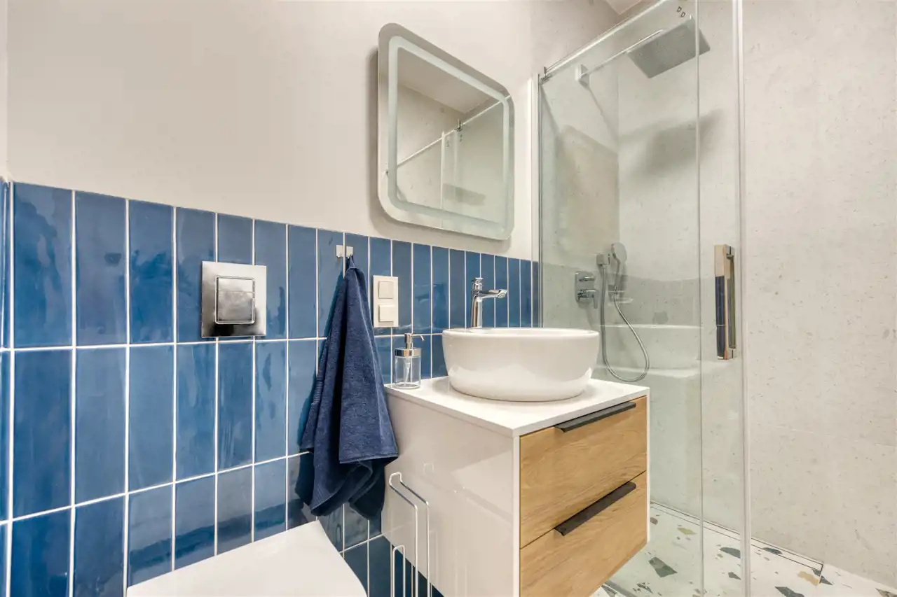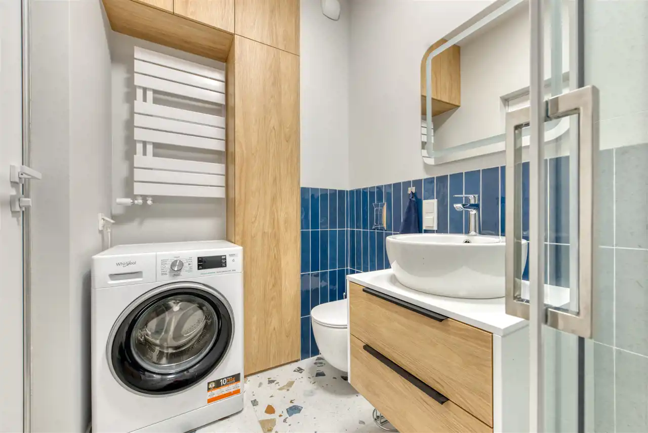 - nowoczesną łazienkę z WC (wyposażoną w natrysk, umywalkę oraz pralkę);