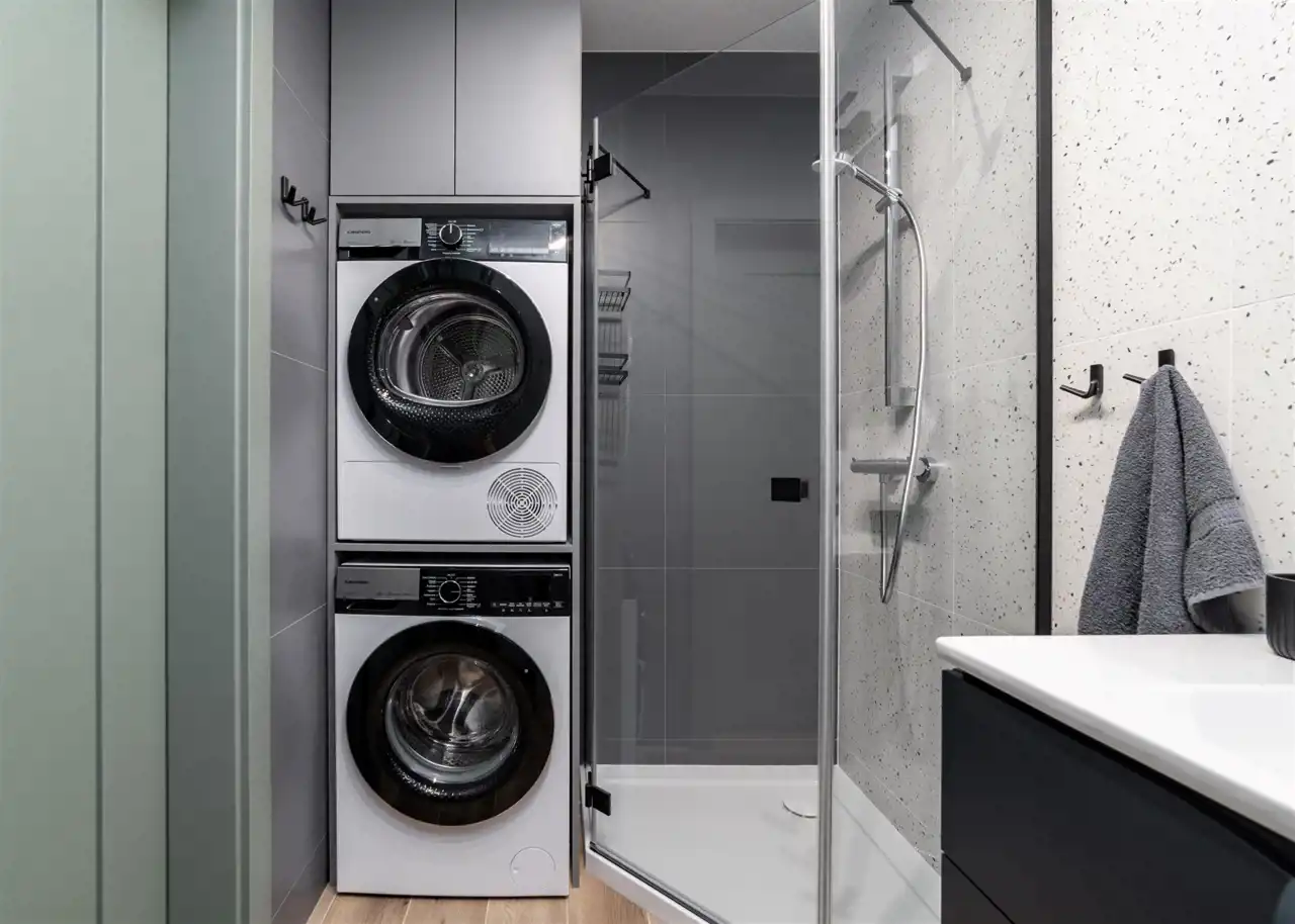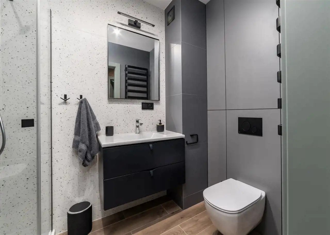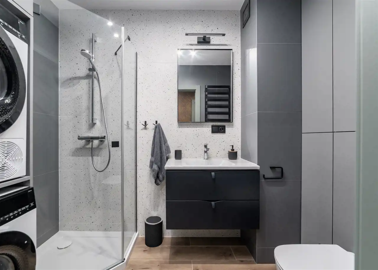 - nowoczesną łazienkę z WC (wyposażoną w natrysk, umywalkę oraz pralko-suszarkę);
