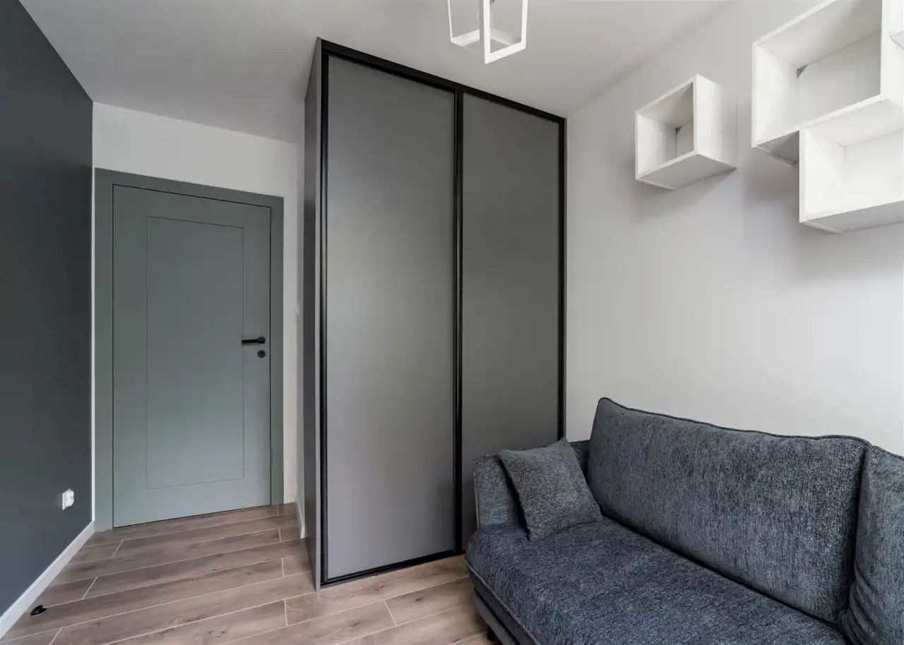 - przytulną sypialnię (wyposażoną w podwójne łóżko, pojemną szafę i komodę);