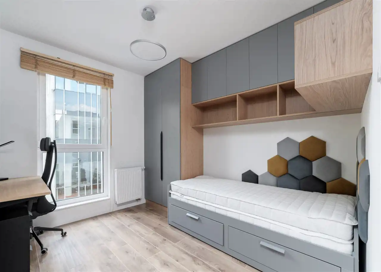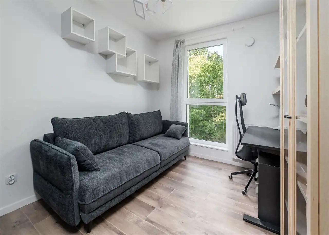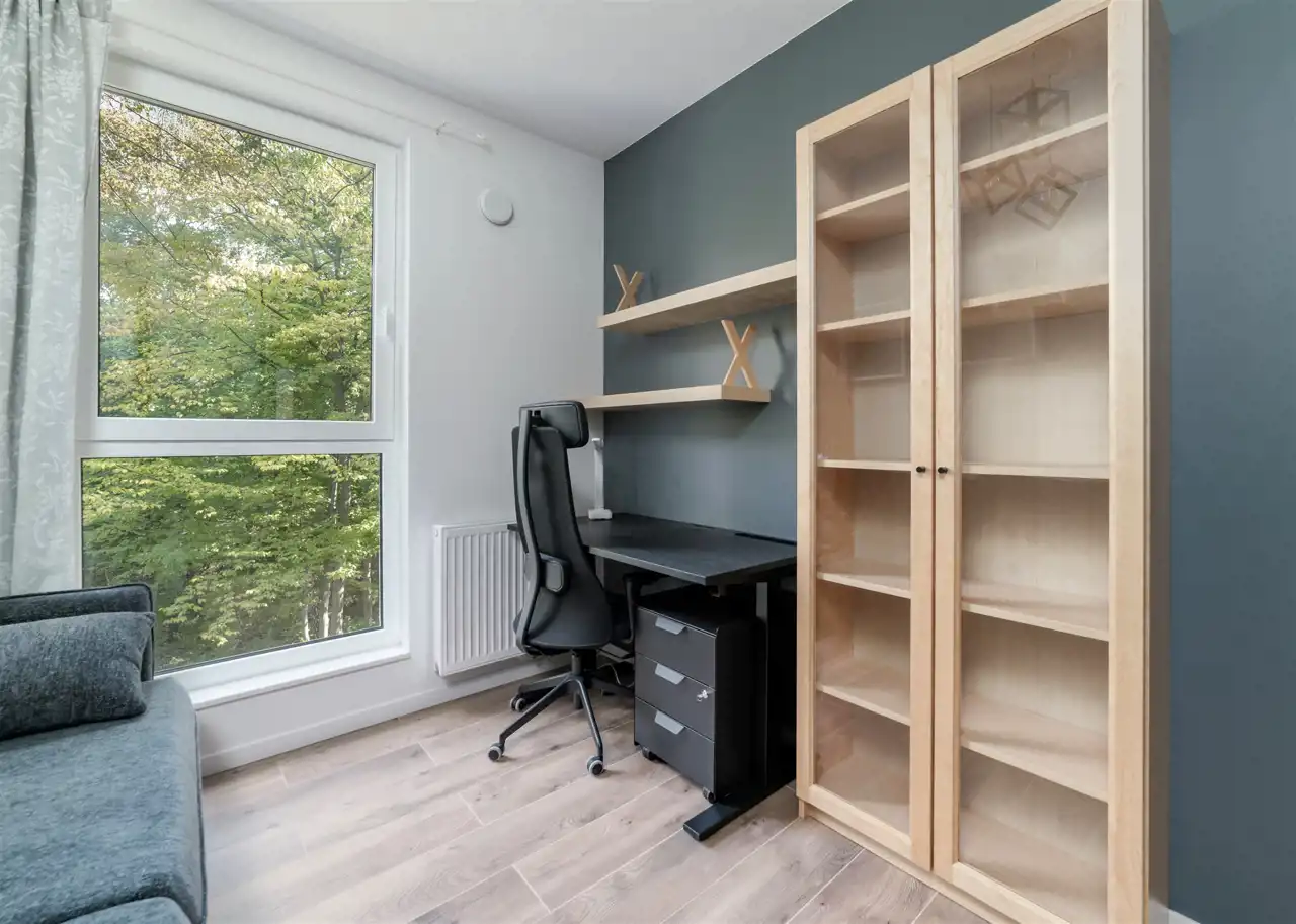 - pokój mogący pełnić funkcję gabinetu, dodatkowej sypialni lub pokoju dla dziecka (wyposażony w biurko z krzesłem, rozkładane łóżko oraz regał);