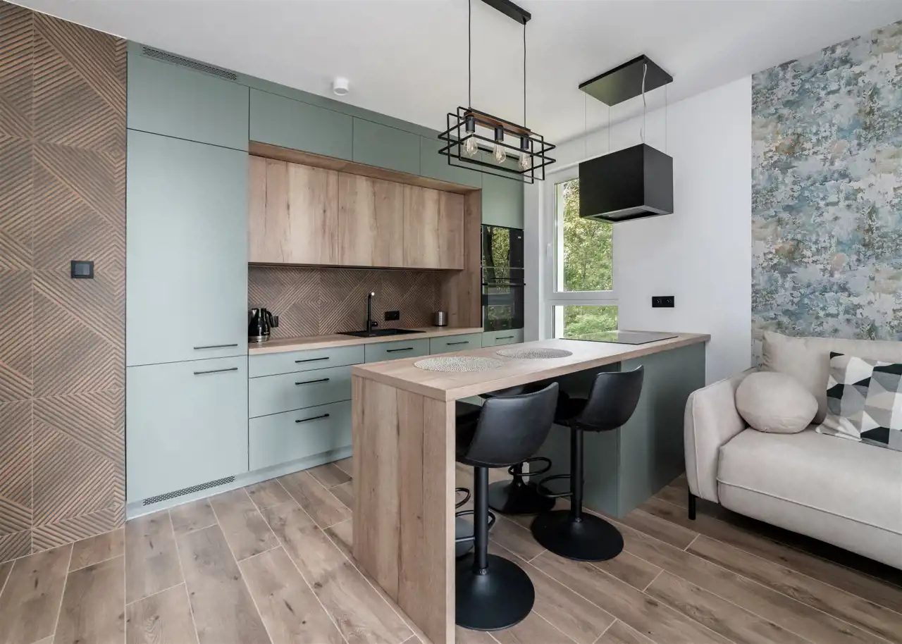 - funkcjonalny aneks kuchenny (wyposażony w płytę indukcyjną, okap, piekarnik, lodówko-zamrażarkę i zmywarkę oraz mikrofalę);
