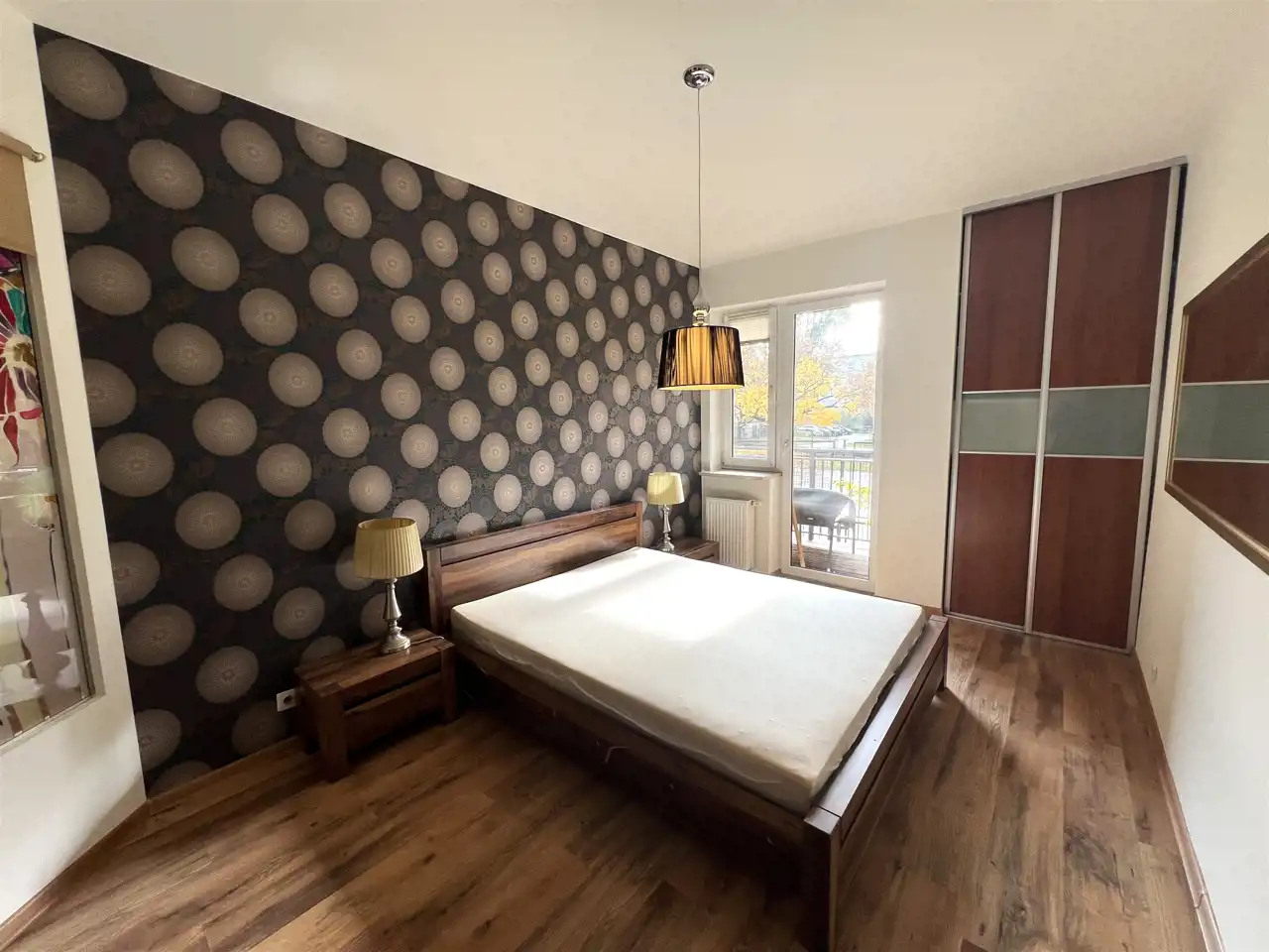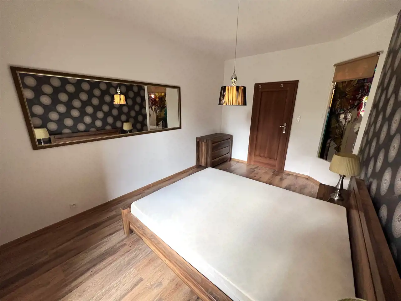 - SYPIALNIA GŁÓWNA Z BALKONEM: 13,5 m2, łóżko podwójne z materacem i nakryciem, 2 szafki nocne + 2 lampki nocne, komoda, szafa wbudowana, z sypialni wyjście na balkon,