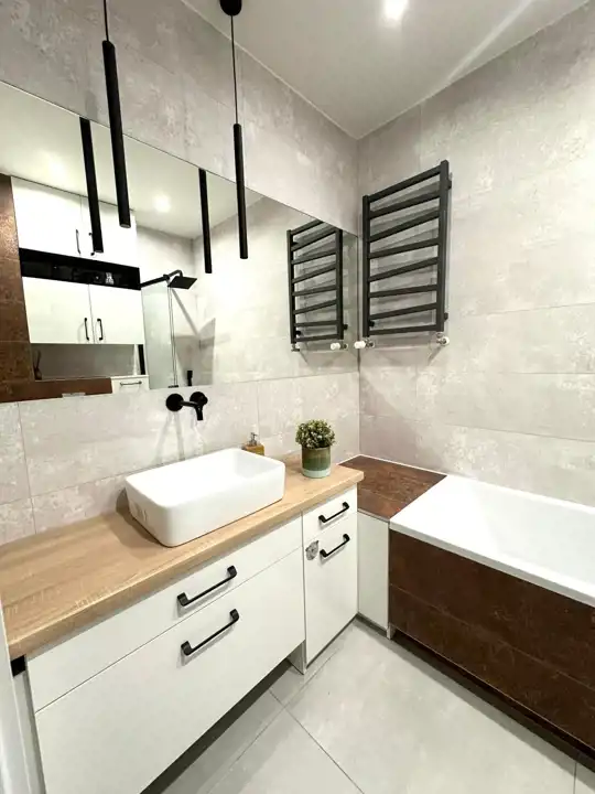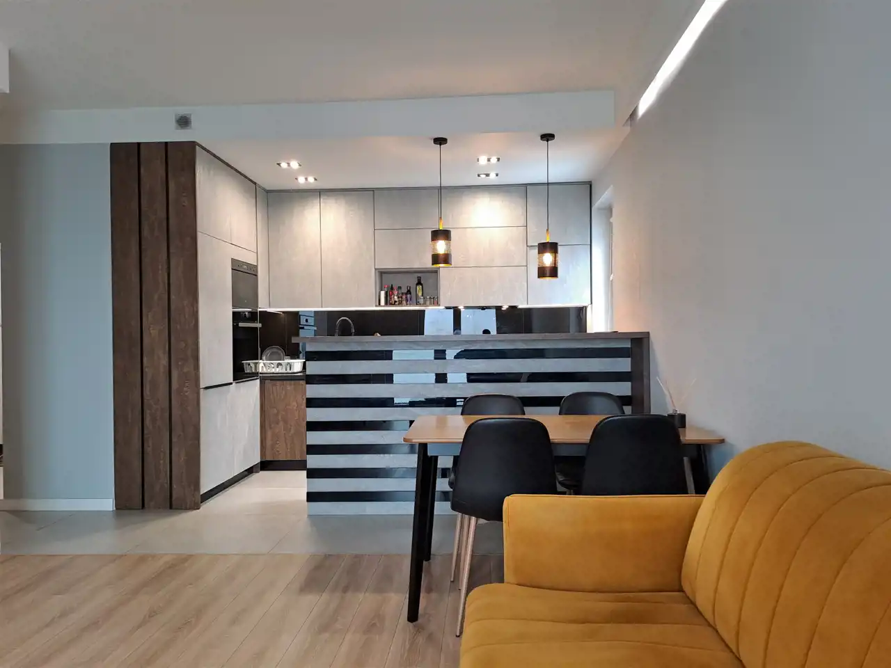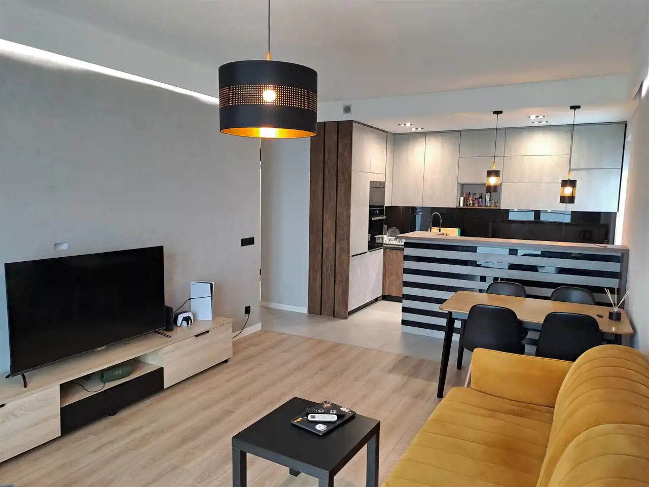 Apartament został wykończony w nowoczesny, niebanalny sposób przez architekta. W salonie znajdziemy wygodną kanapę, stolik kawowy, szafkę RTV, telewizor oraz stół z krzesłami. Aneks kuchenny wyposażony w lodówko-zamrażarkę, zmywarkę, piekarnik, płytę indukcyjną.