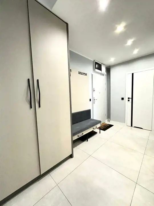 Apartament składa się z 3 pokoi: salonu z aneksem kuchennym, 2 sypialni, łazienki razem z WC oraz przedpokoju. Dodatkowym atutem jest przestronny taras z widokiem na panoramę miasta. Całość wykończona bardzo gustownie przy użyciu materiałów wysokiej jakości. Mieszkanie klimatyzowane. Na terenie osiedla znajduje się rowerownia.