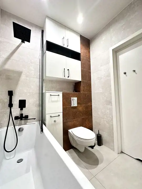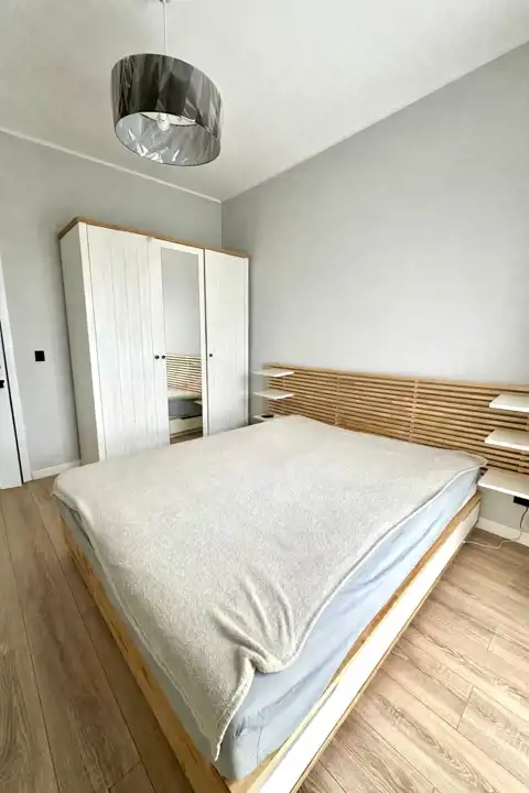 W sypialni znajduje się dwuosobowe łóżko oraz szafa stojąca. Drugi pokój może zostać zaadaptowany przez najemcę na gabinet. Toaleta z wanną z funkcją prysznica, umywalką, pralką oraz WC. Dodatkowo w przedpokoju znajduje się pakowna szafa z siedziskiem i licznym miejscem do przechowywania.