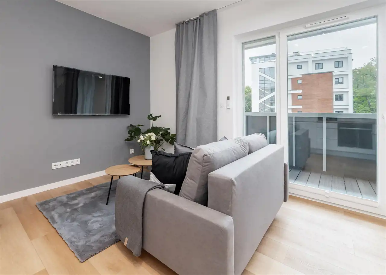 - nowoczesny salon (wyposażony w sofę, stolik kawowy, TV, klimatyzację) z wyjściem na balkon;