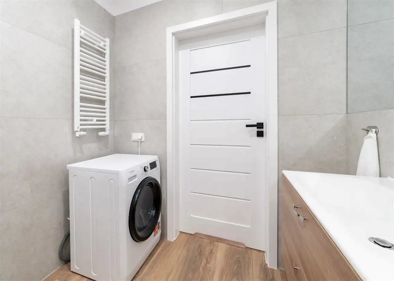 - oryginalną łazienkę z WC wyposażoną w natrysk oraz pralko-suszarkę;