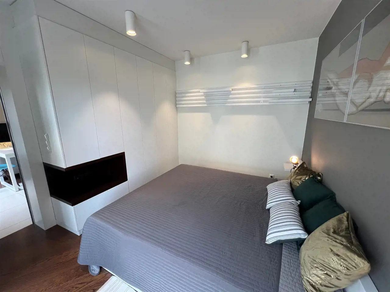 - SYPIALNIA: 7,8 m², łóżko małżeńskie + 2 szafki/półki nocne, duża szafa garderoba w zabudowie, dywanik,