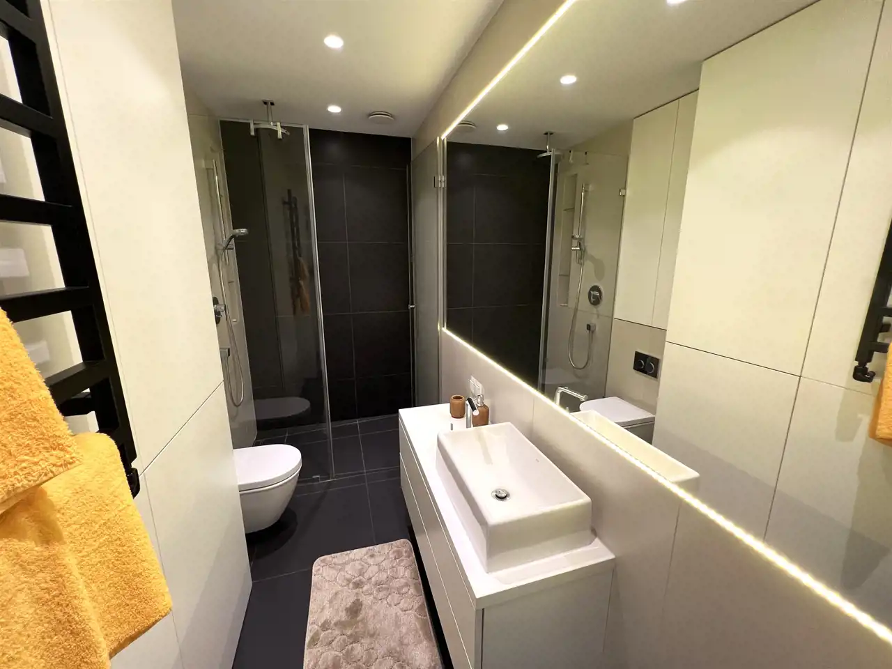 - ŁAZIENKA Z WC: 7,8 m², umywalka z szafką łazienkową z lustrem, kabina prysznicowa, WC, pralka w zabudowie,