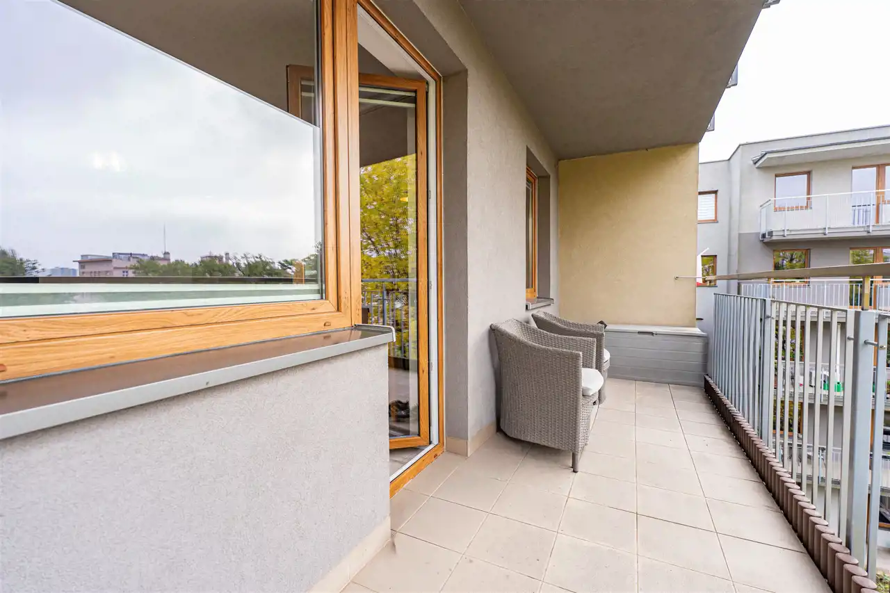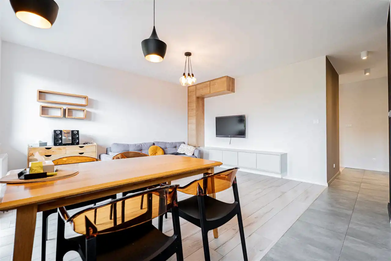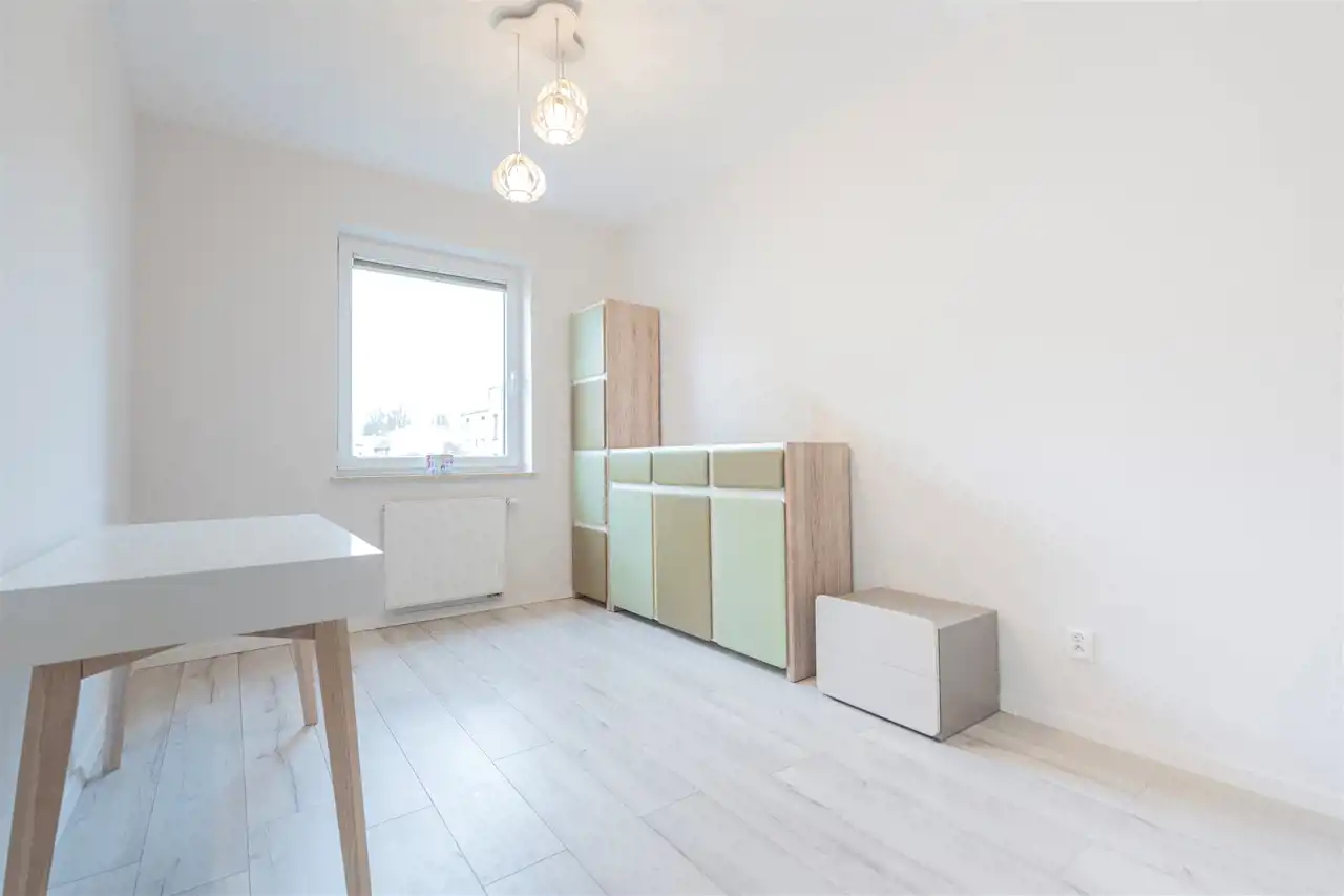 W salonie kanapa z funkcją spania, stolik, stół z krzesłami, szafka RTV oraz TV. Dodatkowo wyjście na duży balkon z widokiem na zieleń. Przy salonie aneks kuchenny, wyposażony w we wszystkie niezbędne sprzęty i meble. Wszystkie sprzęty (lodówka z zamrażarką, piekarnik, płyta indukcyjna, zmywarka) w bardzo dobrym stanie. Salon bardzo przestronny i dobrze nasłoneczniony. Sypialnia główna wyposażona w podwójne łóżka oraz szafę i komody. W drugiej sypialni znajdziemy rozkładaną kanapę oraz szafę. Łazienka przestronna, wyposażona w kabinę prysznicową z deszczownicą. Dodatkowo ogromne lustro, WC, umywalka i pralka. Łazienka urządzona w stylu komponującym się z resztą mieszkania. Dodatkowo oddzielne WC z umywalką. W przedpokoju funkcjonalna, duża szafa.
