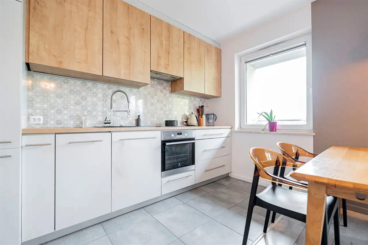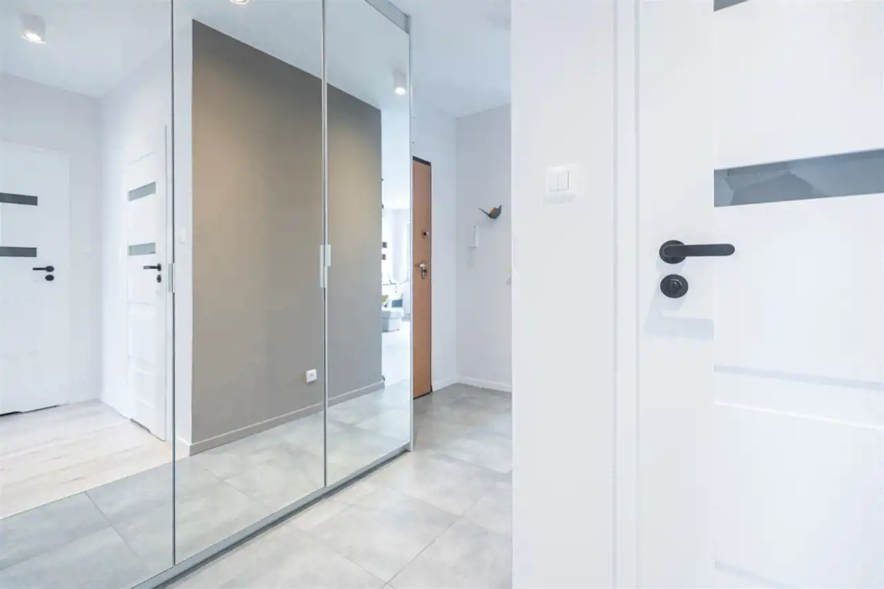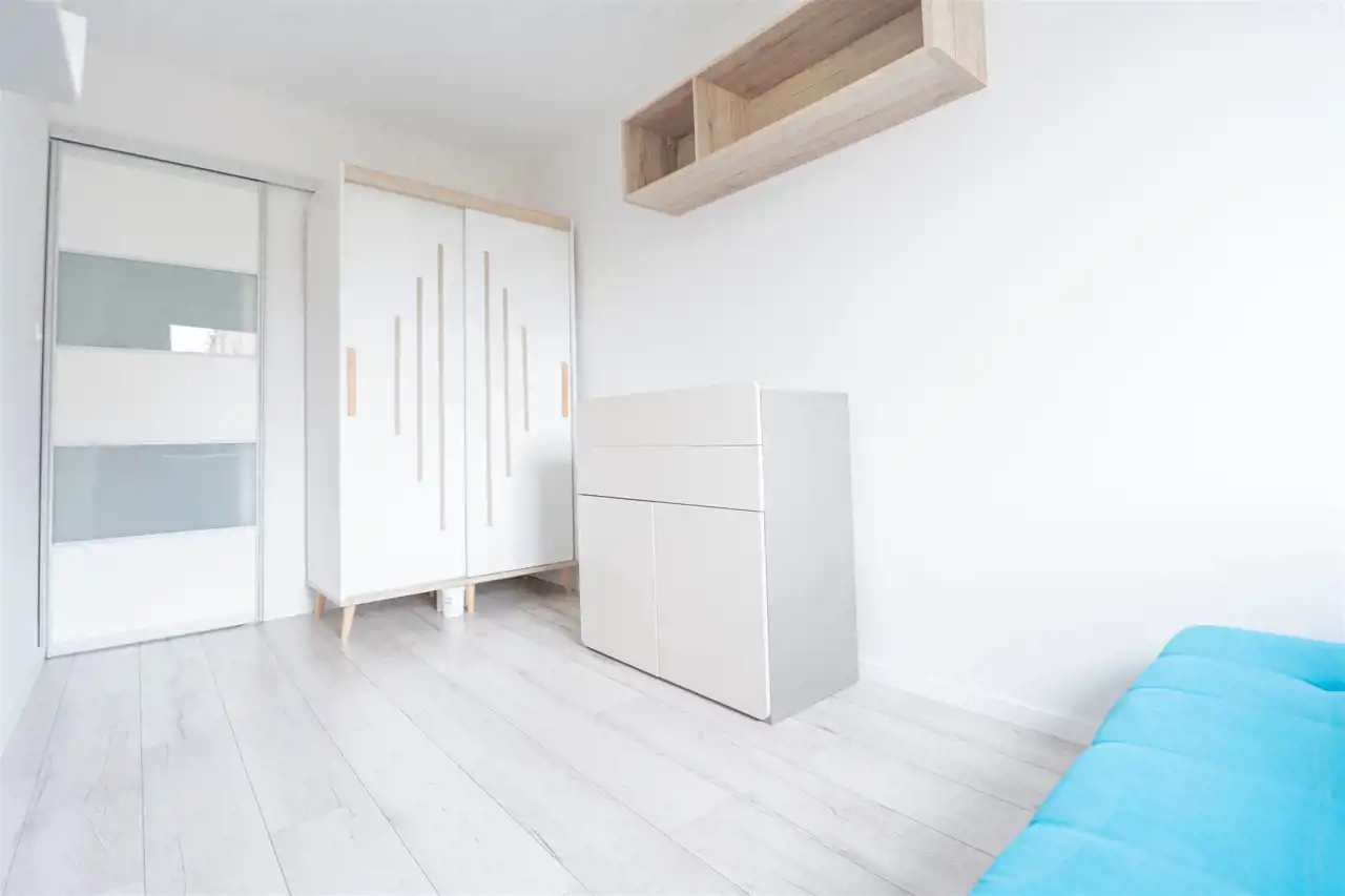 W salonie kanapa z funkcją spania, stolik, stół z krzesłami, szafka RTV oraz TV. Dodatkowo wyjście na duży balkon z widokiem na zieleń. Przy salonie aneks kuchenny, wyposażony w we wszystkie niezbędne sprzęty i meble. Wszystkie sprzęty (lodówka z zamrażarką, piekarnik, płyta indukcyjna, zmywarka) w bardzo dobrym stanie. Salon bardzo przestronny i dobrze nasłoneczniony. Sypialnia główna wyposażona w podwójne łóżka oraz szafę i komody. W drugiej sypialni znajdziemy rozkładaną kanapę oraz szafę. Łazienka przestronna, wyposażona w kabinę prysznicową z deszczownicą. Dodatkowo ogromne lustro, WC, umywalka i pralka. Łazienka urządzona w stylu komponującym się z resztą mieszkania. Dodatkowo oddzielne WC z umywalką. W przedpokoju funkcjonalna, duża szafa.
