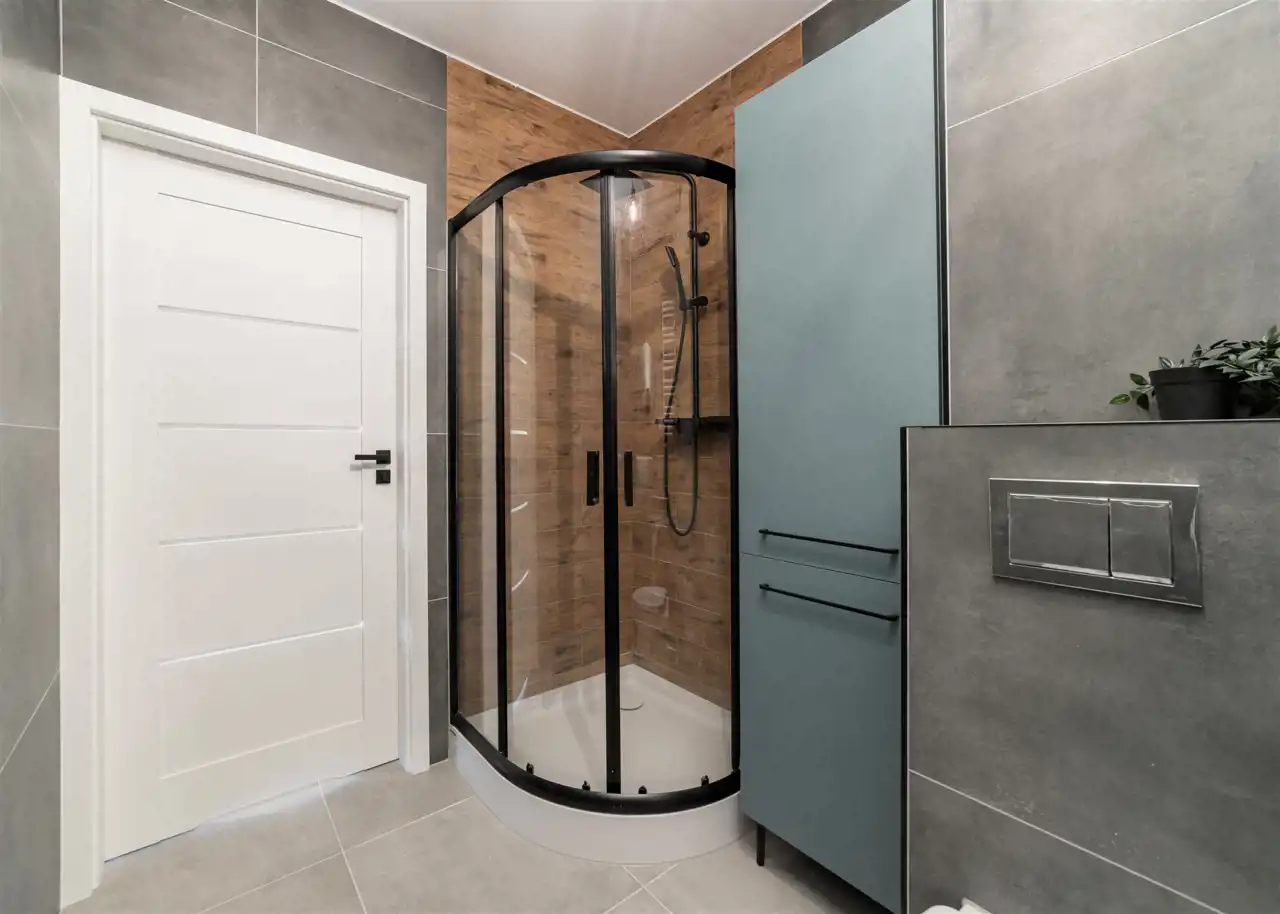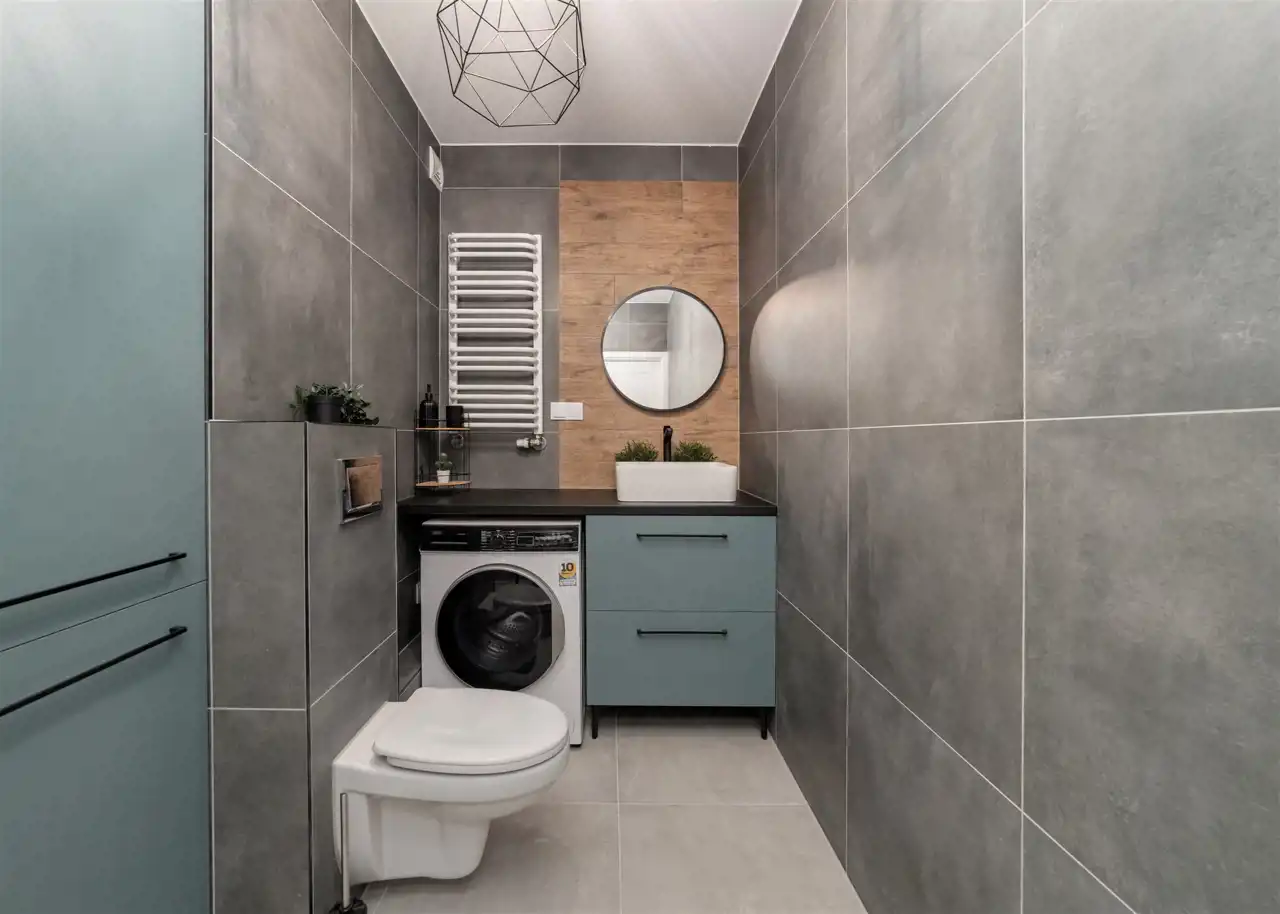 - nowoczesną łazienkę z WC wyposażoną w prysznic i umywalkę oraz pralko-suszarkę;